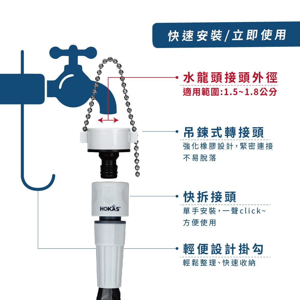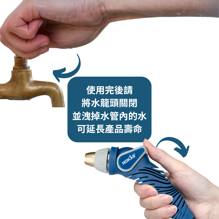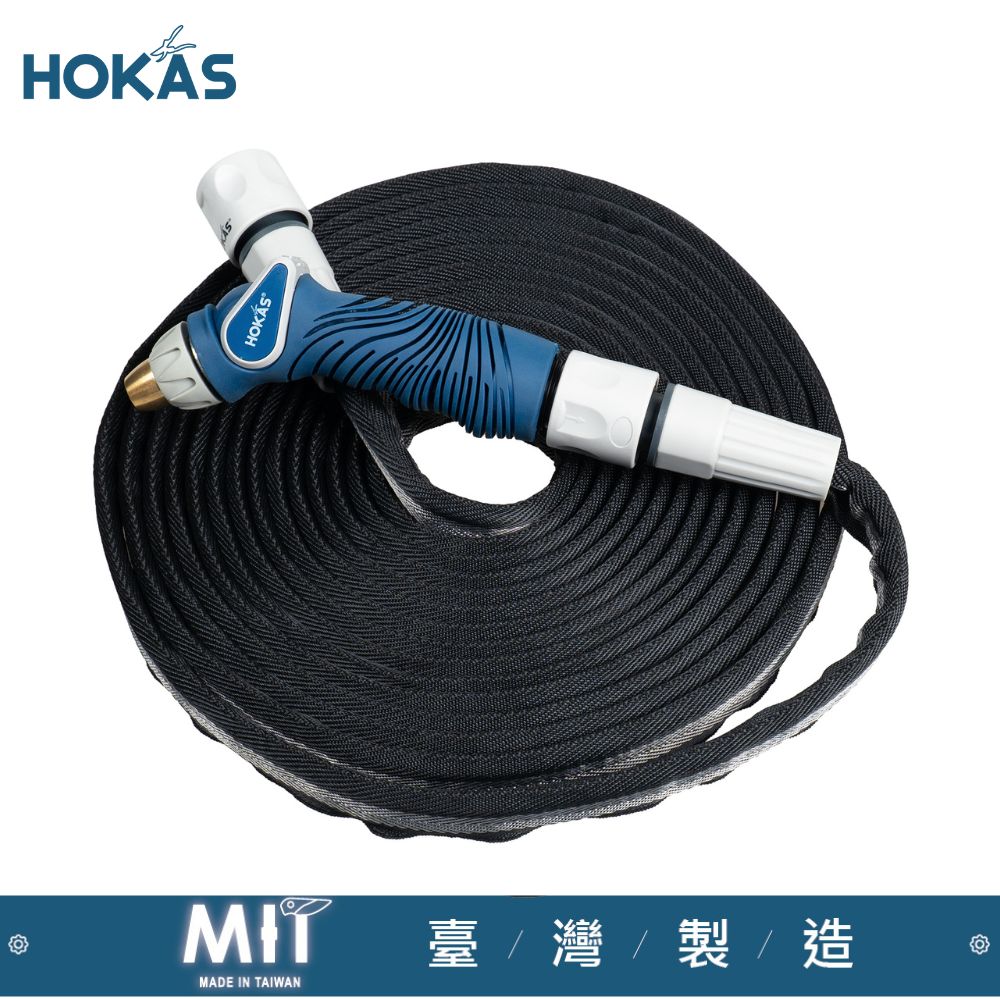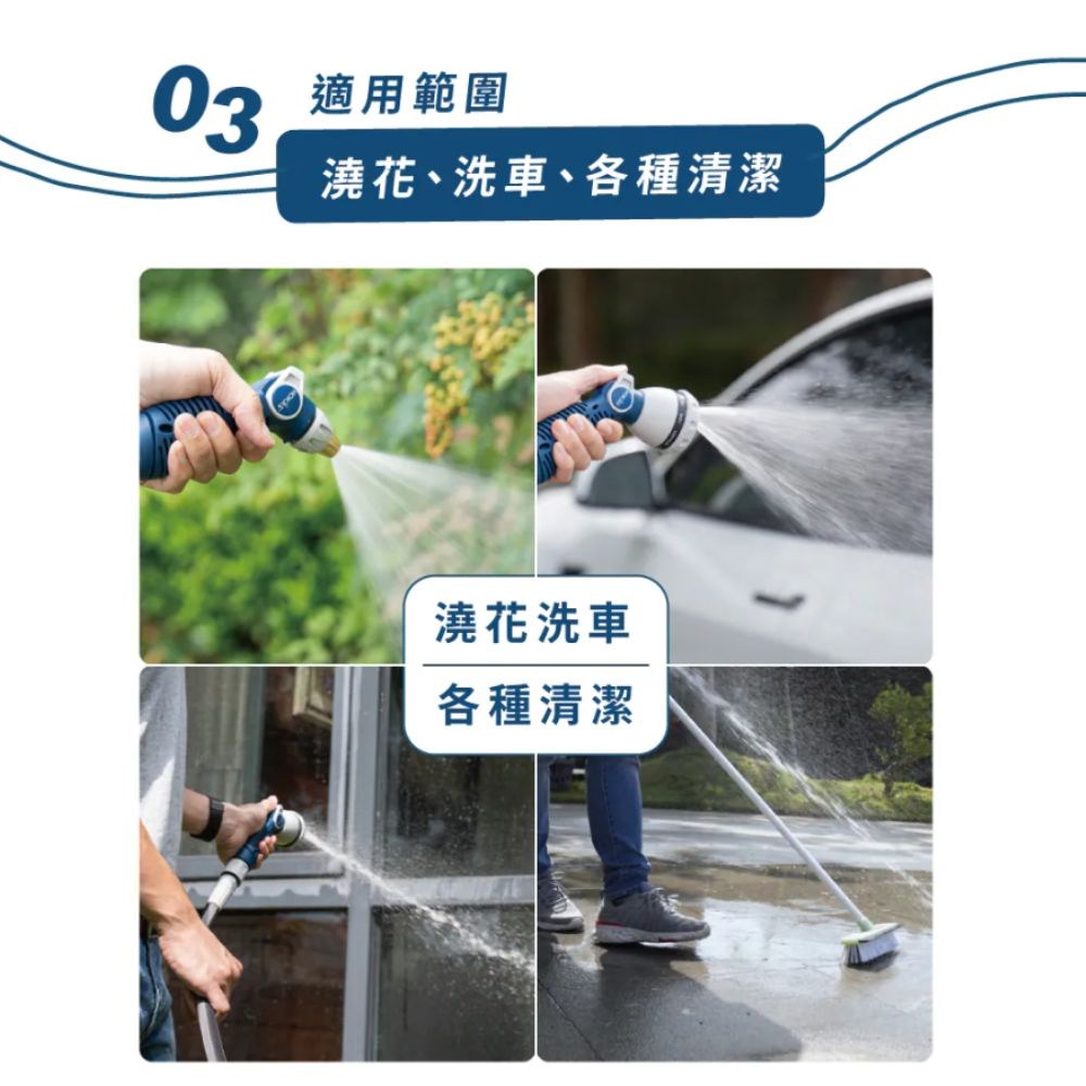 ※產品建議工作水壓為3kg/cm2 您可以依照使用範圍需求挑選合適的水槍水管組合,不管是家庭花園,還是洗車或做其他清潔都非常適用。適用範圍:園藝澆水、洗車、洗紗窗/玻璃、浴室廁所清潔、戶外地板髒汙清潔、鐵門/招牌/高處清洗、寵物洗澡。強打功能:• 國內首創!耐用評比第一!耐高溫、抗紫外線,亦耐磨損、防爆、防漏、防穿刺,即使水管打結也能不間斷供水• 水管為扁平設計,對比傳統水管,HOKAS水管更輕巧好整理,也不會因收納不當造成水管凹折而影響出水的情況• 產品使用快拆接頭連接,無須工具就能快速使用• 附吊鍊式水龍頭接頭,可穩固的將產品鍊在水龍頭上防止脫落,並特別加強產品內側的橡膠厚度跟長度,解決連接處漏水問題。• 買整組送專屬掛勾,使用完畢後即可將水管掛起來晾乾,收納簡便且不易造成摺痕,解決傳統水管收納不當造成出水不順的問題。• 水管外層由PP+強力特多龍特殊編織製程,內管採用新型防爆 ECO 材料,具耐磨、防爆、防漏、防穿刺、可緩衝水柱壓力等特點,並且不易扭曲、打結。• 我們的產品在德國、加拿大、美國、台灣獲得專利。• 通過加州65號提案飲用水無毒檢驗標準。• 水管可承受高達80℃的高溫,並且不易產生苔蘚和細菌。注意事項:*使用後請將水管內的水排洩掉,延長產品使用壽命。*請放置於高處、孩童無法取得之處,避免發生意外。*使用時盡量避開灌木類帶刺植物、玻璃片、鐵片、釘狀物等尖銳物體。*使用時避免強硬拉扯,導致外層布套磨損。*工作水壓3~5kg/cm2 之間為最佳使用範圍。*當外層水管布套與接頭脫落時,應立即停止使用,內層水管未受到外層布套保護時,內管易破損且具危險性。*水管請勿放置於高溫下曝曬,易加速外層布套老化,導致布套保護力不佳。*水管使用完畢後,請將管內剩餘的水量釋出,收納時放置於陰涼通風處風乾,請勿讓管內長時間積水,易產生發霉。*發現水管有龜裂老化情況時,建議更換新品,以避免發生水管爆裂而產生危險。*水管如已過水視同使用過,述不退貨