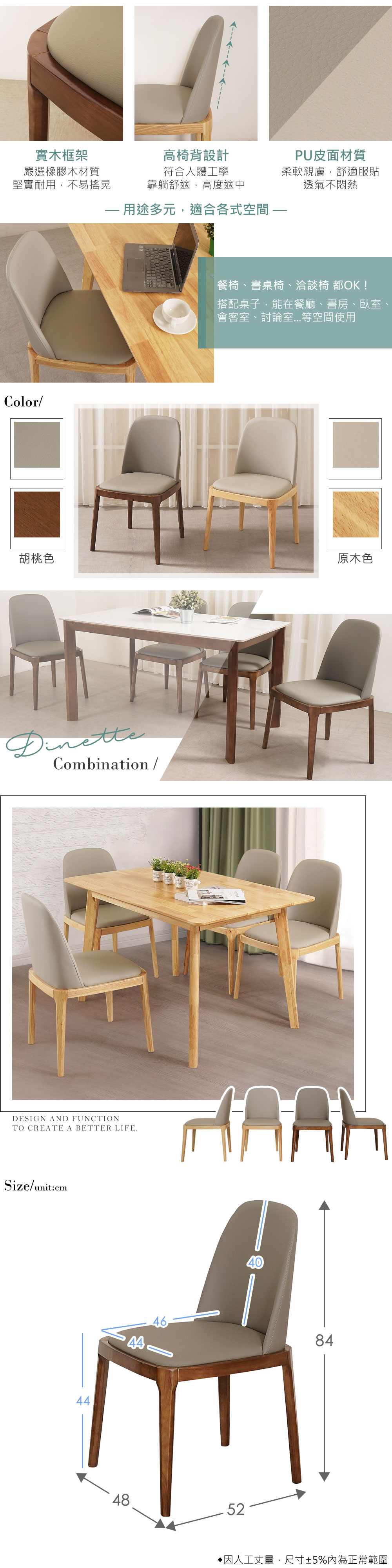 ◆實木材質結構,穩固耐用◆質感PU皮坐墊,舒適好坐◆柔軟親膚的皮質椅背設計◆免自行組裝,專人配送到府整體配件:餐椅 x 4入尺寸:寬 48 x 深 52 x 高 84 公分材質:橡膠木、PU皮面顏色:原木色產地:中國誤差值:因人工丈量,尺寸±5%內為正常範圍