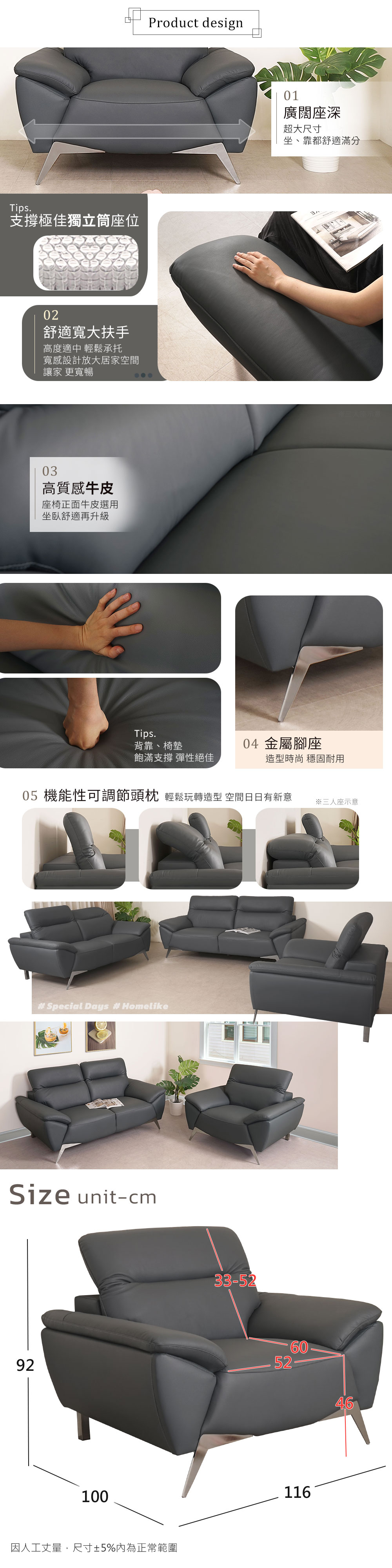 【Homelike】喜家居單人座調節式頭枕皮革沙發(2428)