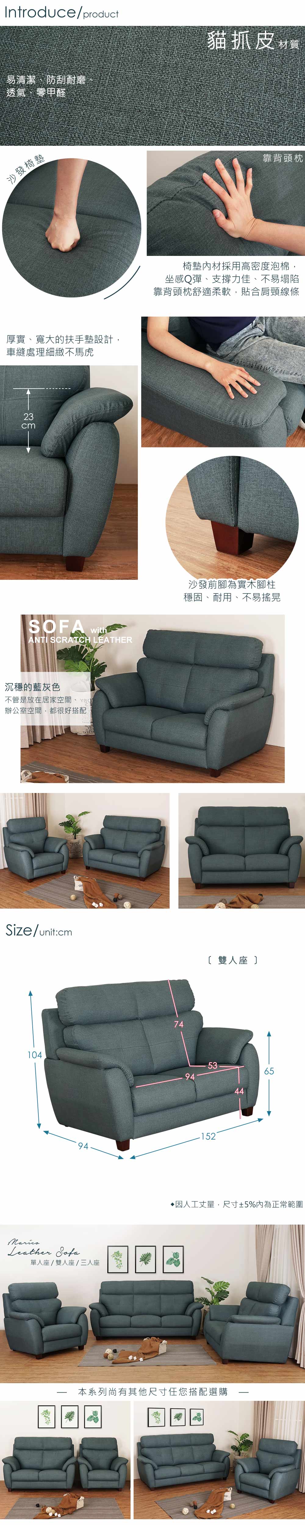 ◆強韌、耐磨的貓抓皮材質◆寬大、舒適的扶手設計◆穩固、耐用的實木腳柱◆免組裝,專人宅配到府◆容易清潔,支撐性較強的坐感◆客廳、臥室皆適合的雙人沙發尺寸:寬 152 x 深 94 x 高 104 公分材質:貓抓皮、高密度泡棉、實木腳顏色:藍灰色產地:台灣誤差值:因人工丈量,尺寸±5%內為正常範圍