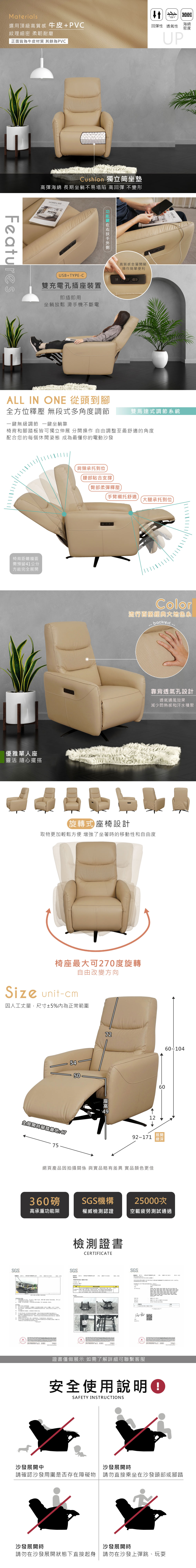 ◆實用便利旋轉式座椅設計◆優雅單人座,可隨心擺搭◆雙馬達系統,多角度調節◆一鍵自由躺,全方位釋壓◆選用頂級高質感牛皮材質◆獨立筒彈簧坐墊,彈性佳◆實用二種充電式插座裝置◆免組裝,由專人配送到府