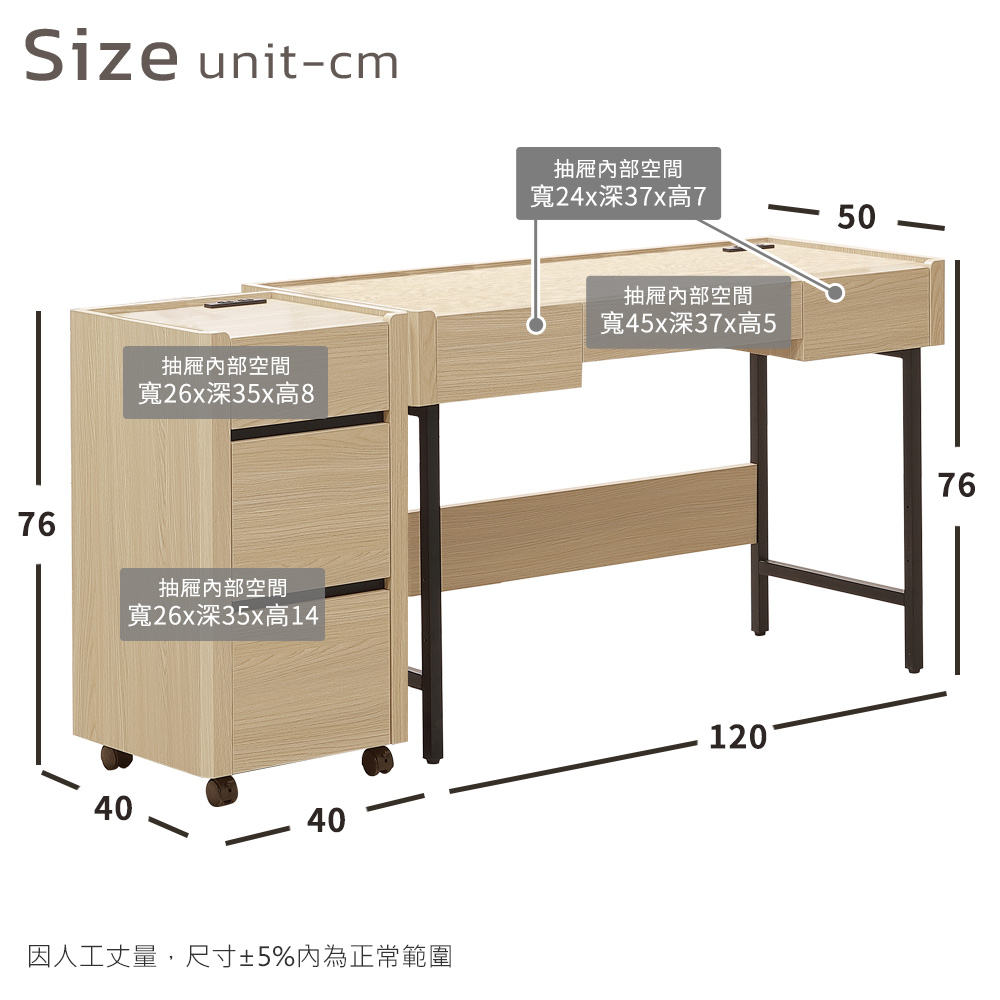 ◆木心板材質,堅實、穩固、耐用◆五抽屜設計,分類收納好整齊◆金屬鐵腳結構支撐,穩固性更佳◆櫃緣淺槽設計預防物品滾落◆附加插座,隨時都方便好充電◆二普二煞滾輪,移動靜止都方便◆免組裝,專人配送到府整組搭配:書桌 x 1 + 活動櫃 x 1活動櫃尺寸:寬 40 x 深 40 x 高 76 公分書桌尺寸:寬 120 x 深 50 x 高 76 公分材質:高級木心板顏色:杉木色產地:台灣誤差值:因人工丈量,尺寸±5%內為正常範圍