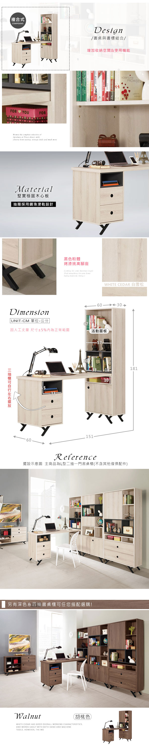 ◆雪松色,自然清新百搭◆書櫃與書桌複合式設計◆木心板堅實穩固又耐用◆免組裝,專人配送到府◆日式風格◆簡約的書房,舒適的一天◆二抽屜收納空間尺寸:寬 151 x 深 60 x 高 181 cm材質:高級木心板、高碳鋼管顏色:雪松色產地:台灣誤差值:因人工丈量,尺寸±5%內為正常範圍