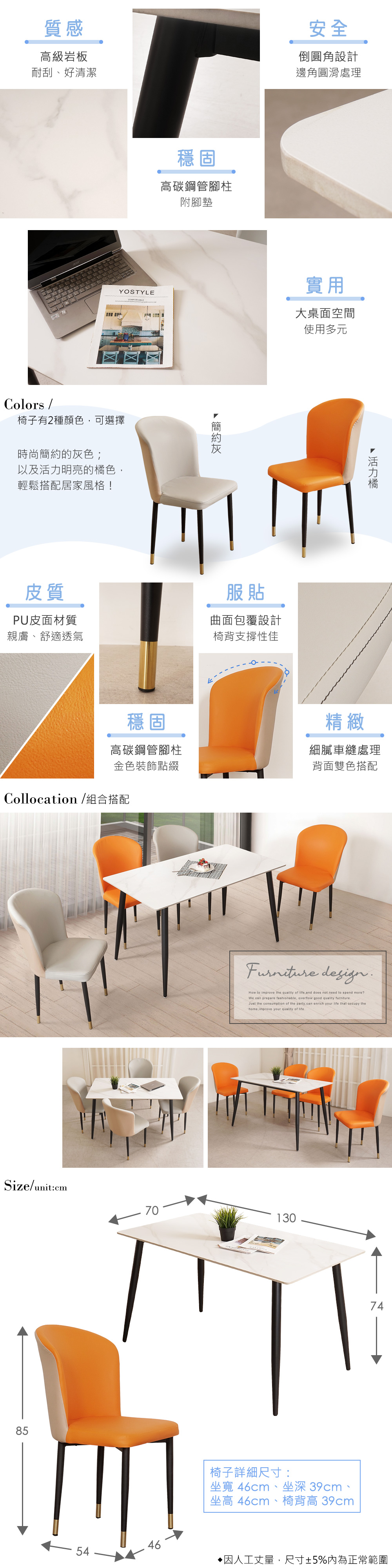◆具自然紋路的美型岩板檯面◆桌面耐刮、耐高溫、好清潔◆質感PU皮坐墊,舒適好坐◆免自行組裝,專人配送到府整體配件:餐桌 x 1 + 餐椅 x 4桌子尺寸:寬 130 x 深 70 x 高 74 公分椅子尺寸:寬 46 x 深 54 x 高 85 公分桌子材質:岩板、高碳鋼管椅子材質:高碳鋼管、PU皮面顏色:桌子-白色、椅子-橘色產地:中國誤差值:因人工丈量,尺寸±5%內為正常範圍