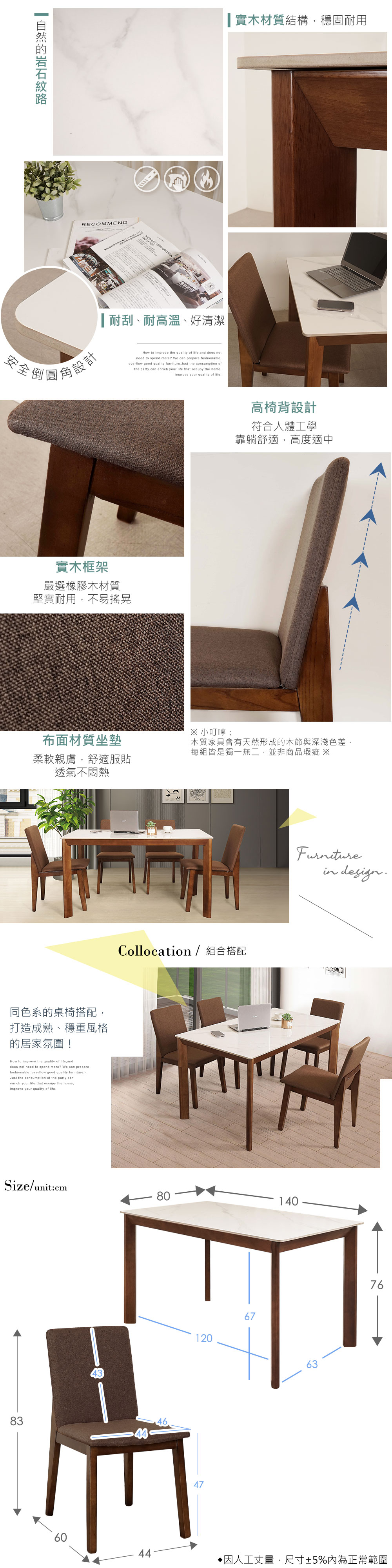 ◆岩板耐刮、耐高溫、好清潔◆實木材質結構,穩固耐用◆質感布面坐墊,舒適好坐◆清新好搭配的大地胡桃色系◆免自行組裝,專人配送到府整體配件:餐桌 x 1 + 餐椅 x 4桌子尺寸:寬 140 x 深 80 x 高 76 公分椅子尺寸:寬 44 x 深 60 x 高 83 公分桌子材質:橡膠木、岩板椅子材質:橡膠木、布面顏色:胡桃色產地:中國誤差值:因人工丈量,尺寸±5%內為正常範圍
