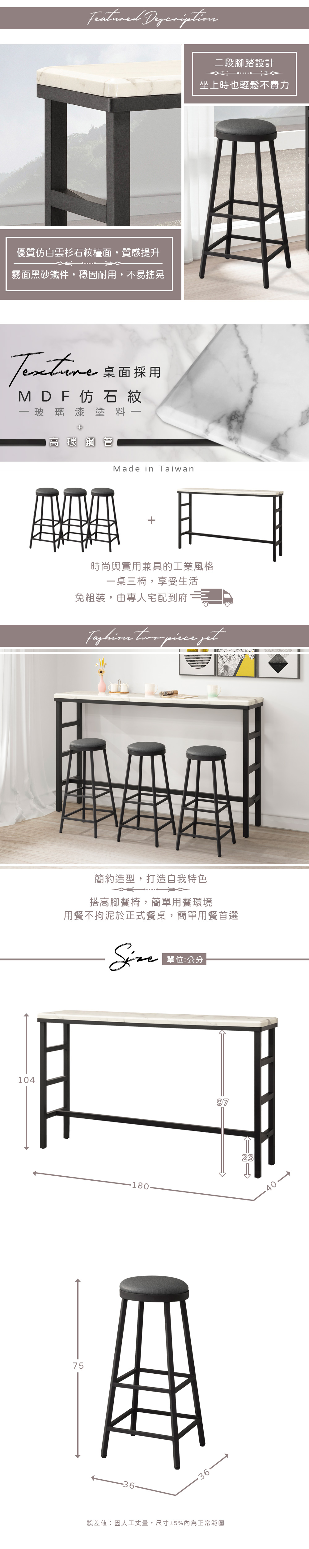 ◆仿白雲杉石紋檯面 質感提升◆簡約造型,打造自我特色◆一桌三椅,享受生活◆免組裝,由專人宅配到府◆工業風格+灰橡色調◆書房、客廳、辦公室、工作室、廚房都適用吧台尺寸:寬 180 x 深 40 x 高 104 公分吧台椅尺寸:寬 36 x 深 36 x 高 75 公分材質:MDF仿石紋(玻璃漆塗料)、高碳鋼管顏色:雲杉色產地:台灣誤差值:因人工丈量,尺寸±5%內為正常範圍