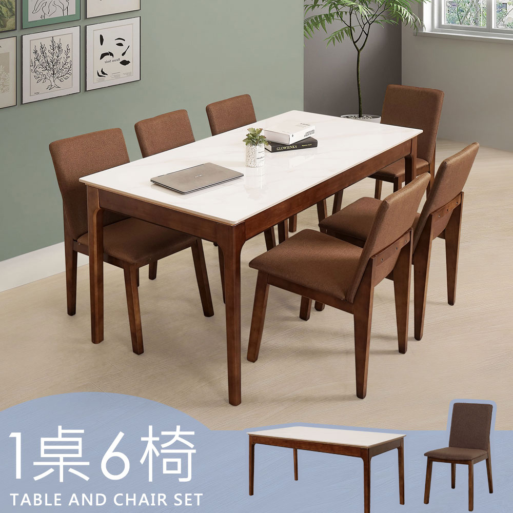 【Homelike】喜家居岩板餐桌椅組(一桌六椅)-胡桃色(2420-66)