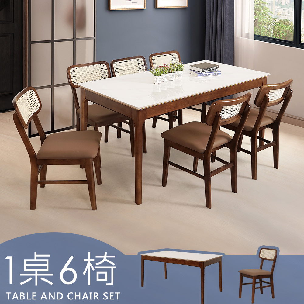 【Homelike】喜家居岩板餐桌椅組(一桌六椅)-胡桃色(2420-10)
