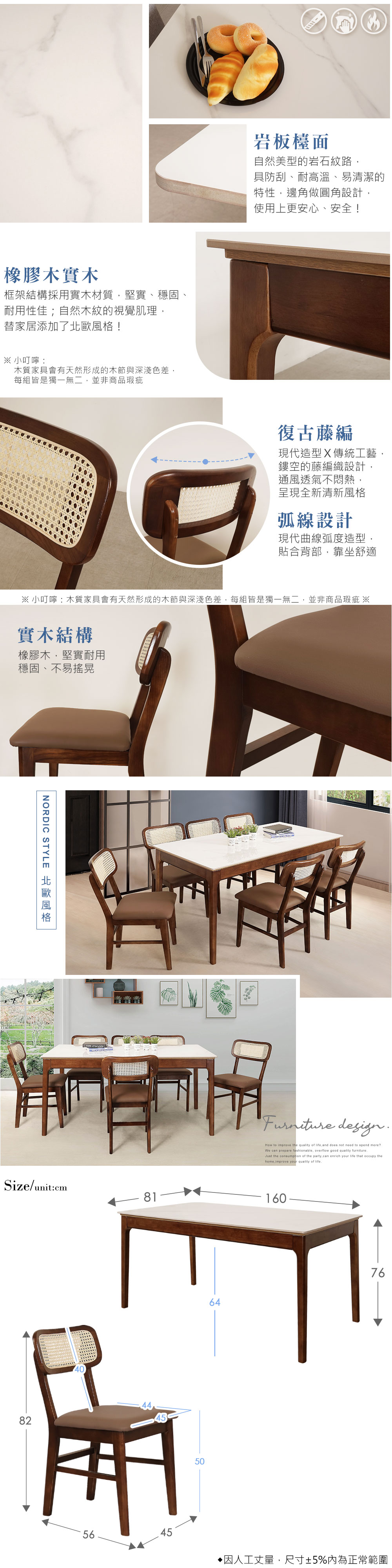 ◆大尺寸160cm的美型岩板檯面◆耐刮、耐高溫、好清潔◆實木材質結構,穩固耐用◆現代X傳統工藝,鏤空藤編風格◆貓抓皮坐墊,透氣、舒適好坐◆免自行組裝,專人配送到府整體配件:餐桌 x 1 + 餐椅 x 6餐桌尺寸:寬 160 x 深 81 x 高 76 公分餐椅尺寸:寬 45 x 深 56 x 高 82 公分餐桌材質:橡膠木、岩板、MDF餐椅材質:橡膠木、藤、貓抓皮坐墊顏色:胡桃色產地:中國誤差值:因人工丈量,尺寸±5%內為正常範圍