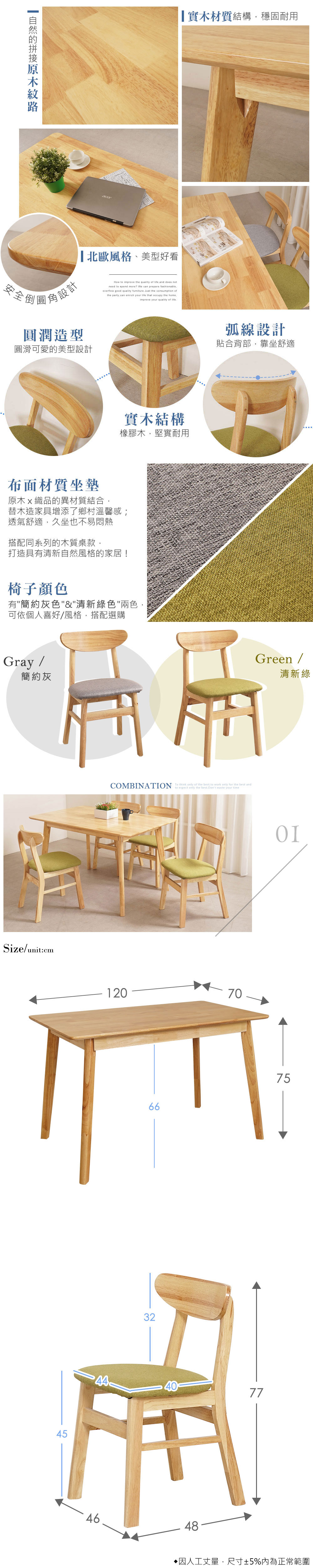 ◆實木材質結構,穩固耐用◆北歐鄉村風格,美型好搭◆質感布面坐墊,舒適好坐◆免自行組裝,專人配送到府整體配件:餐桌 x 1 + 餐椅 x 4桌子尺寸:寬 120 x 深 81 x 高 75 公分椅子尺寸:寬 46 x 深 48 x 高 77 公分桌子材質:橡膠木椅子材質:橡膠木、布面顏色:桌子-原木色、椅子-灰色/綠色產地:中國誤差值:因人工丈量,尺寸±5%內為正常範圍