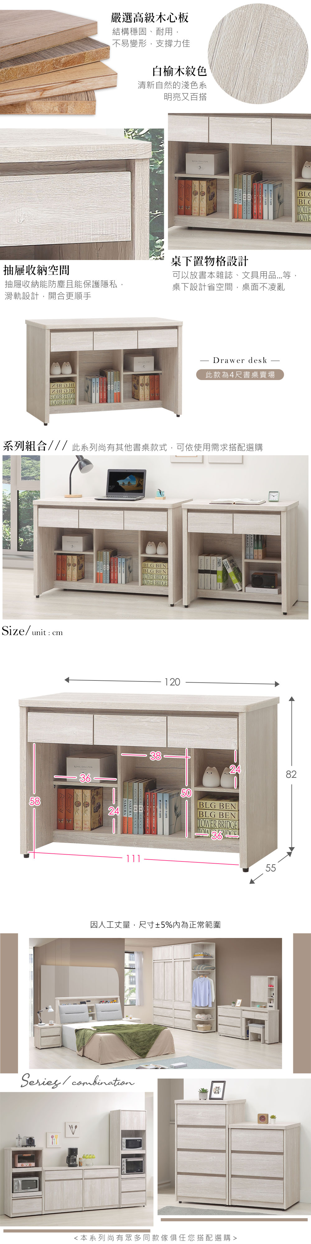 ◆木心板材質,堅實、穩固、耐用◆清新淺色系,質感木紋路視覺◆抽屜設計,分類物品、收納防塵◆桌下開放置物格,增加收納空間◆免組裝,由專人宅配到府尺寸:寬 120 x 深 55 x 高 82 公分材質:高級木心板顏色:白榆木色產地:台灣誤差值:因人工丈量,尺寸±5%內為正常範圍