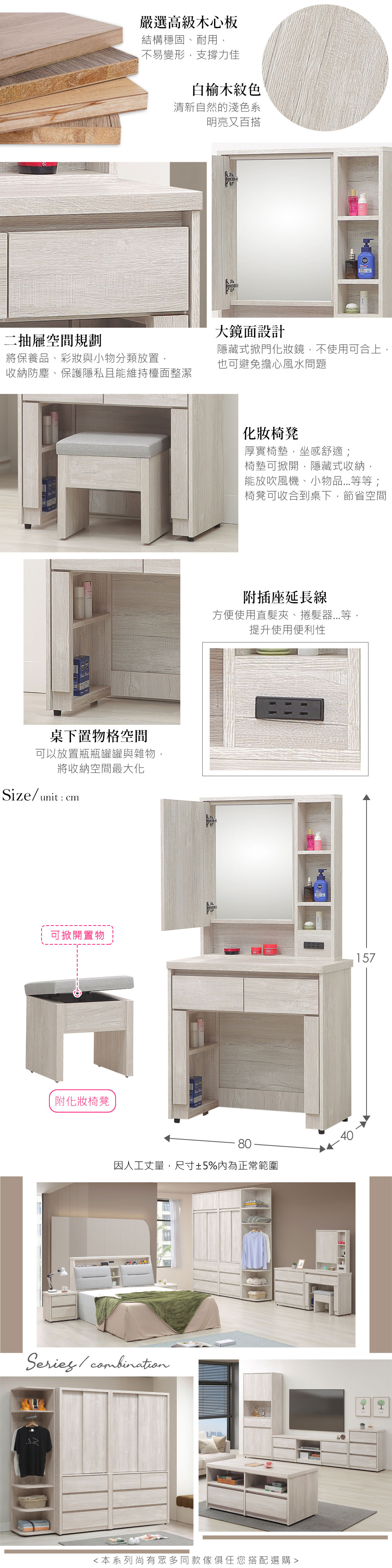 ◆木心板材質,堅實、穩固、耐用◆清新淺色系,質感木紋路視覺◆隱藏式掀門化妝鏡設計,便利性佳◆抽屜+置物格空間,收納多元、好分類◆附插座,方便使用美容電器,好實用◆免組裝,由專人宅配到府尺寸:寬 80 x 深 40 x 高 157 公分材質:高級木心板顏色:白榆木色產地:台灣誤差值:因人工丈量,尺寸±5%內為正常範圍