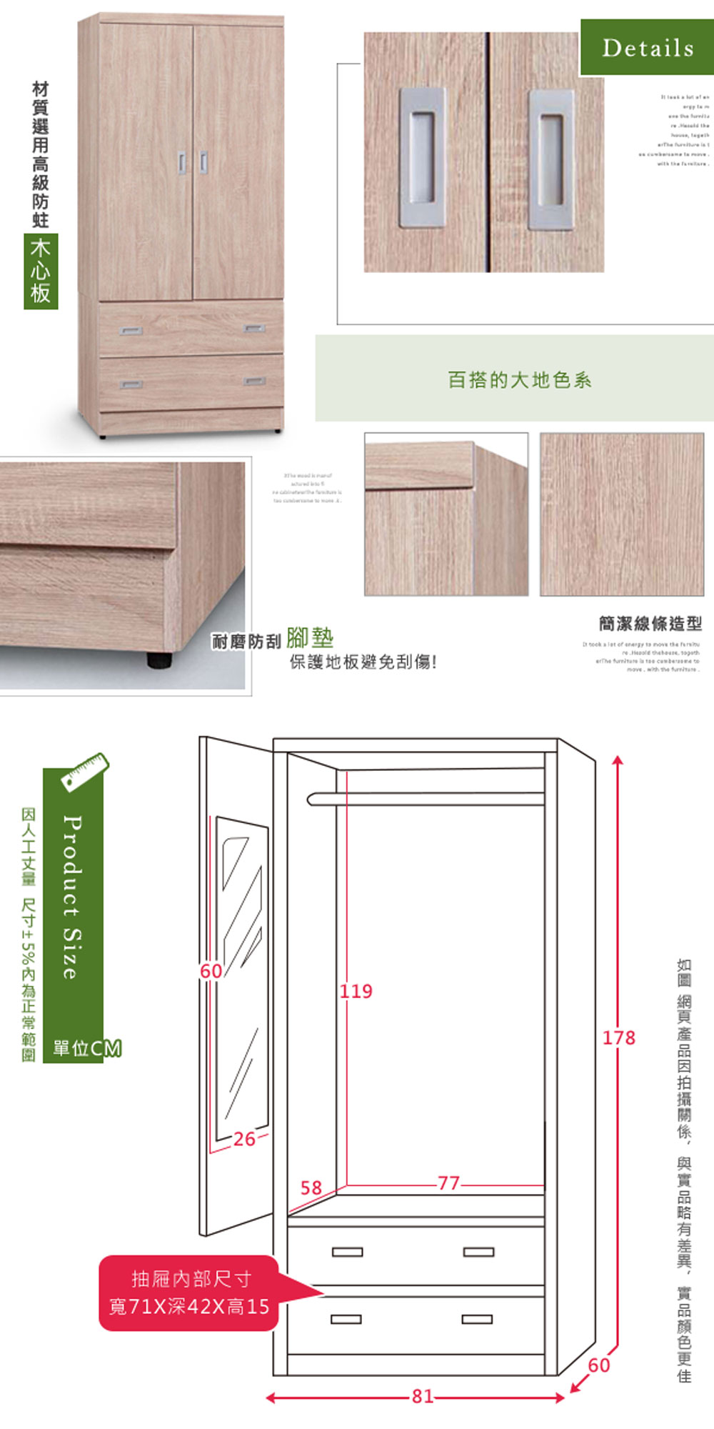 ◆二大抽屜,實用收納空間◆簡約風格,百搭大地色系◆附穿衣鏡,輕鬆梳妝打扮◆日式、現代、簡約風格◆臥室、更衣室衣物空間尺寸:寬 81 x 深 60 x 高 178 公分材質:高級木心板顏色:梧桐產地:台灣誤差值:因人工丈量,尺寸±5%內為正常範圍