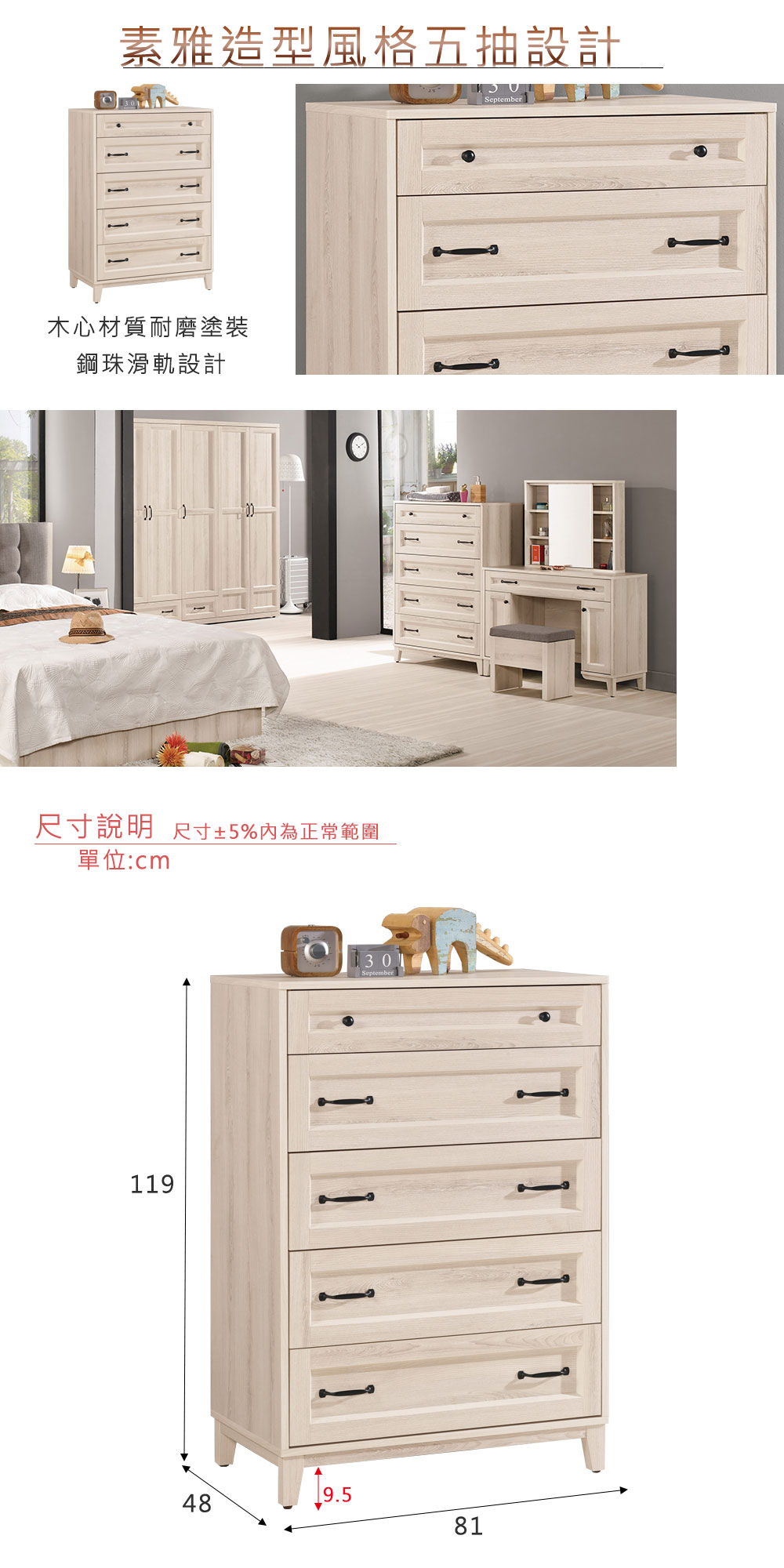 ◆ MIT鋼珠滑軌,開闔不費力◆分層多抽屜,更好分類收納◆挑高腳座,掃地機器人好進◆免自行組裝,專人配送到府◆現代、日式風格◆客廳、臥室、書房存放萬物的經典商品◆分隔五抽屜便捷存取您的收藏尺寸:寬 81 x 深 48 x 高 119 公分材質:高級木心板顏色:洗白木紋產地:台灣誤差值:因人工丈量,尺寸±5%內為正常範圍