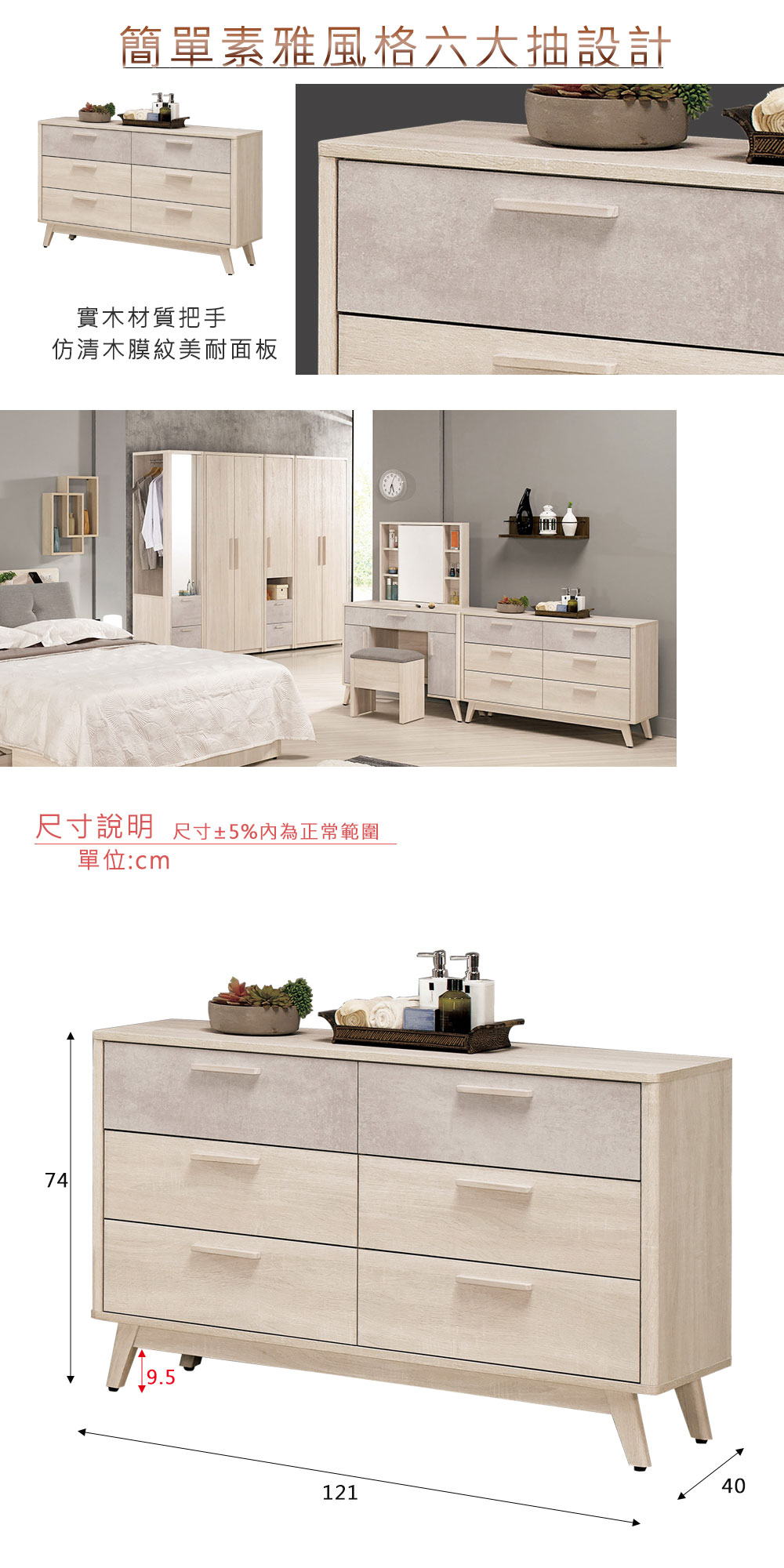 ◆實木腳座,整體結構更穩固◆面板仿清水膜設計,耐刮磨◆ MIT鋼珠滑軌,開闔不費力◆免自行組裝,專人配送到府◆日式素雅簡約風格◆客廳、臥室、書房的經典商品◆大容量六抽屜櫃存放物品尺寸:寬 121 x 深 40 x 高 74 公分材質:高級木心板顏色:洗白木紋產地:台灣誤差值:因人工丈量,尺寸±5%內為正常範圍
