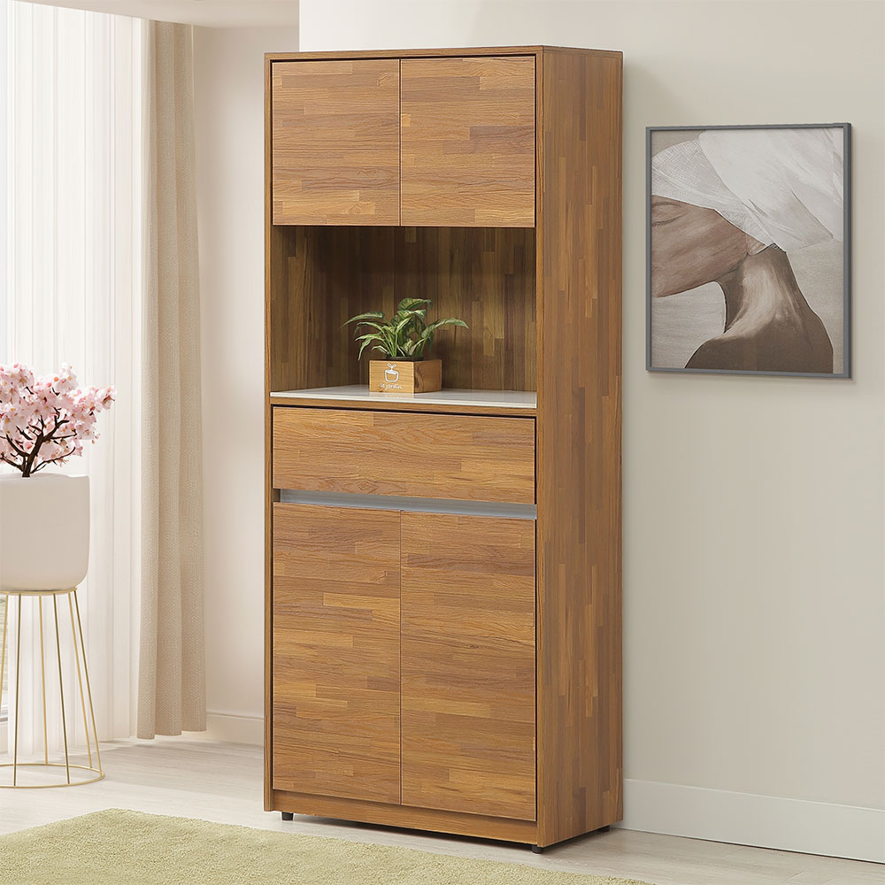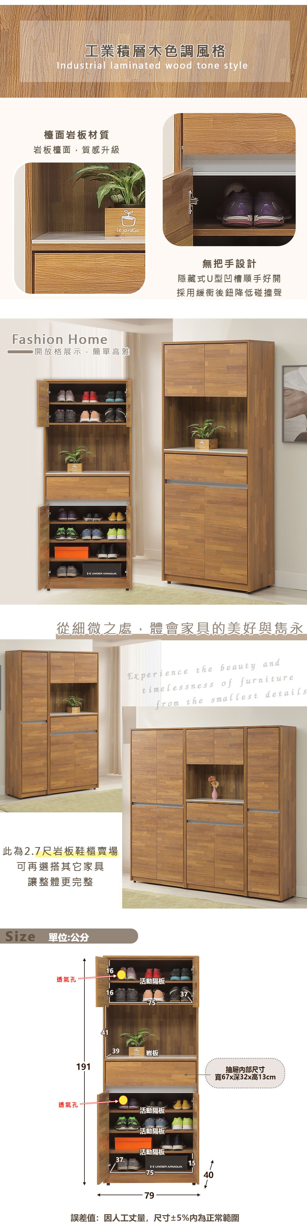 ◆無把手設計,採用隱藏式U型凹槽◆檯面採用岩板材質,好整理◆工業積層木色調風格◆安心配送,由專人到府組裝尺寸:寬 79 x 深 40 x 高 191 公分材質:高級木心板顏色:積層木色產地:台灣誤差值:因人工丈量,尺寸±5%內為正常範圍