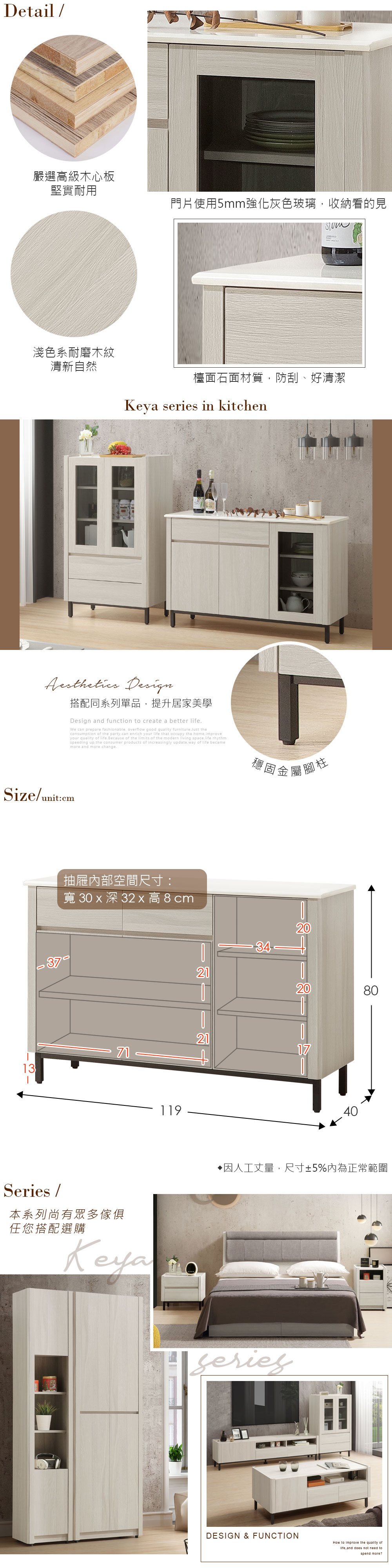 ◆木心板材質,堅實、穩固、耐用◆清新淺色系,質感木紋路視覺◆5mm強化灰色玻璃,美型、微透視感◆餐櫃檯面岩板材質,防刮、耐磨、好清潔◆門片使用緩衝五金,開合安全、避免夾手◆門櫃+抽屜的防塵收納規劃◆免組裝,專人配送到府尺寸:寬 119 x 深 40 x 高 80 公分材質:高級木心板、岩板、5mm強化玻璃、鐵腳顏色:白榆木色產地:台灣誤差值:因人工丈量,尺寸±5%內為正常範圍