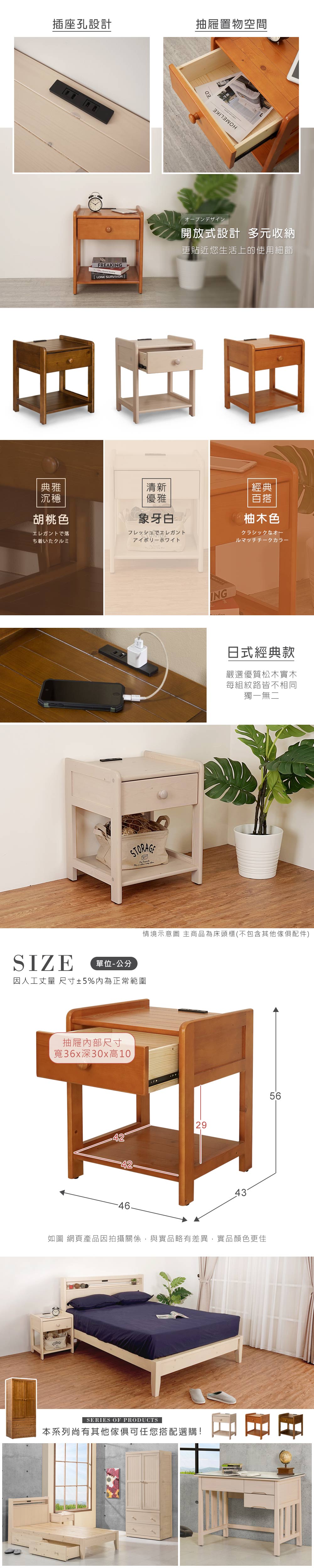 ◆開放格+抽屜置物空間◆實用便利,插座孔設計◆堅韌優質松木實木打造◆免組裝,專人配送到府◆清雅簡靜的日式風格◆臥室、客廳角落經典單品尺寸:寬 46 x 深 43 x 高 56 cm材質:松木實木顏色:象牙白、柚木色、胡桃色產地:越南誤差值:因人工丈量,尺寸±5%內為正常範圍