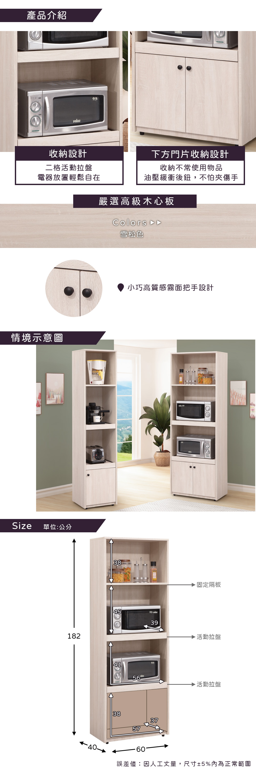 ◆高質感雪松色調◆油壓緩衝後鈕,不怕夾傷手◆二組拉盤,電器輕鬆收納◆免自行組裝,專人配送到府◆日式風格◆廚房、餐廳收納好幫手◆可當餐櫃、高櫃、電器收納櫃、廚櫃尺寸:寬 60 x 深 40 x 高 182 公分材質:高級木心板顏色:雪松色產地:台灣誤差值:因人工丈量,尺寸±5%內為正常範圍