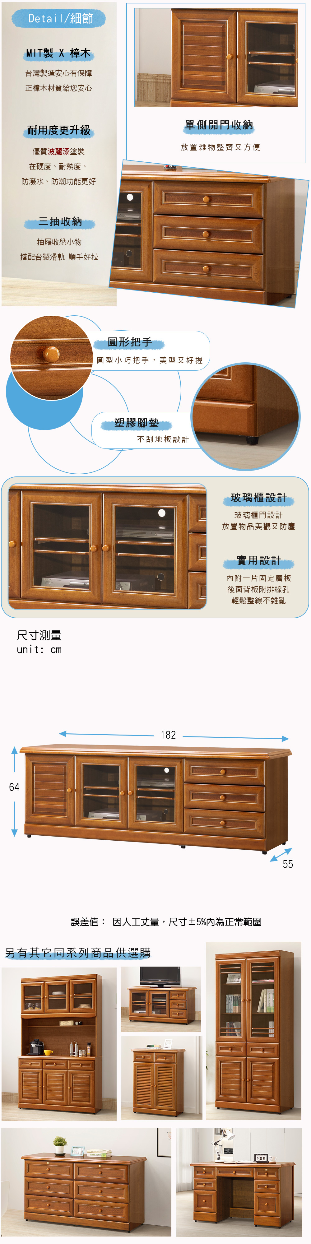◆MIT金屬滑軌,開闔不費力◆附排線孔,輕鬆整線不雜亂◆三抽設計,收納小物更便利◆免自行組裝,專人配送到府◆自然、簡約、傳統、田園風格◆客廳就是要買電視櫃◆實木門片享受木頭的溫馨感受◆三抽屜+玻璃門片設計尺寸:寬 182 x 深 55 x 高 64 cm材質:樟木實木面板+高級木心板顏色:樟木色產地:台灣誤差值: 因人工丈量,尺寸±5%內為正常範圍