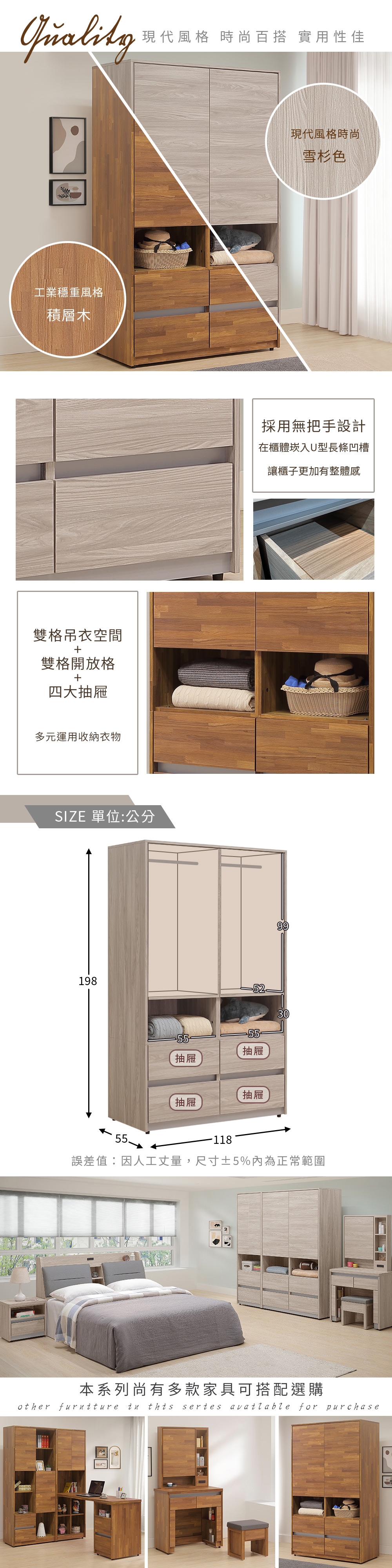 ◆無把手設計,採用隱藏式U型凹槽◆同款二款色調,搭配居家風格◆採用緩衝後鈕,降低碰撞聲◆安心配送,由專人到府組裝◆雪杉簡約、現代風格◆工業積層木色調風格◆四抽屜+吊衣桿收納衣物尺寸:寬 118 x 深 55 x 高 198 公分材質:高級木心板顏色: 雪杉色產地:台灣誤差值:因人工丈量,尺寸±5%內為正常範圍