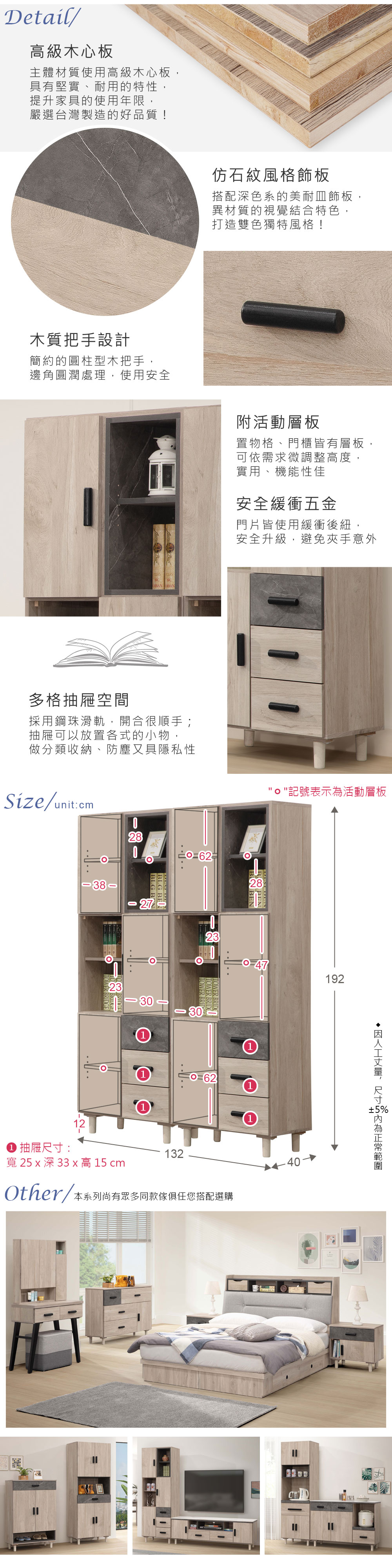 ◆個性獨特的淺灰橡雙色系◆附活動層板,收納好實用◆六格抽屜空間,使用多元◆免組裝,專人配送到府尺寸:寬 132 x 深 40 x 高 192 公分材質:高級木心板顏色:淺灰橡雙色產地:台灣誤差值:因人工丈量,尺寸±5%內為正常範圍