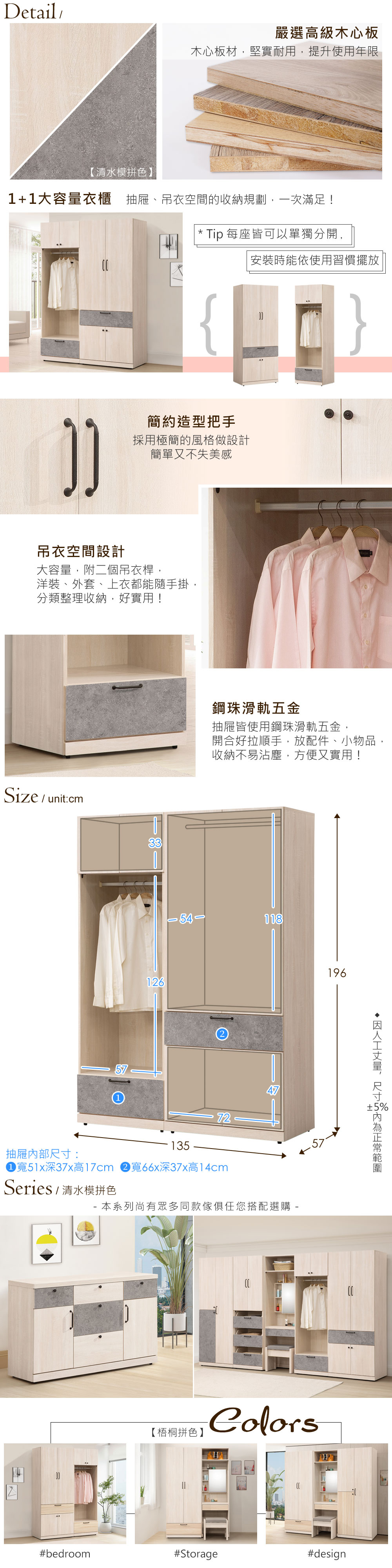 ◆質感雙拼色系,流行時尚◆實用的大容量吊衣空間◆置物格+抽屜的多元收納設計◆免組裝,專人配送到府◆雪松vs.清水模雙色調風格◆二吊衣桿+二抽屜收納空間尺寸:寬 135 x 深 57 x 高 196 公分材質:高級木心板顏色:清水模拼色產地:台灣誤差值:因人工丈量,尺寸±5%內為正常範圍