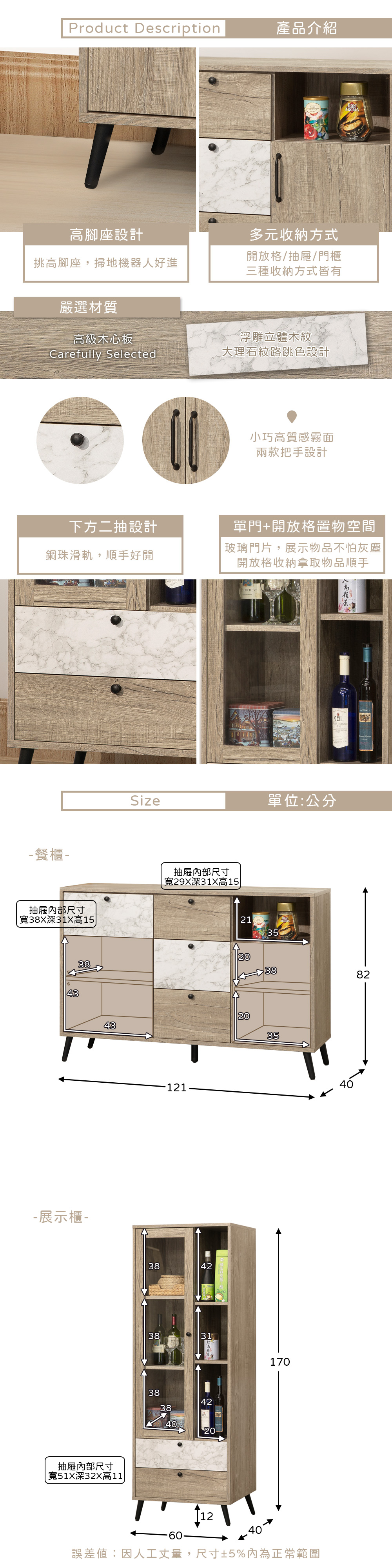 ◆油壓緩衝後鈕,不怕夾傷手◆木紋x大理石紋,蹦出新風格◆挑高腳座,掃地機器人好進◆免自行組裝,專人配送到府◆鄉村、田野梧桐原木風格◆六抽屜+三拉盤設計整組配件:2尺展示櫃 + 4尺餐櫃玻璃櫃尺寸:寬 60 x 深 40 x 高 170 公分餐櫃尺寸:寬 121 x 深 40 x 高 82 公分材質:高級木心板顏色:灰橡木色產地:台灣誤差值:因人工丈量,尺寸±5%內為正常範圍