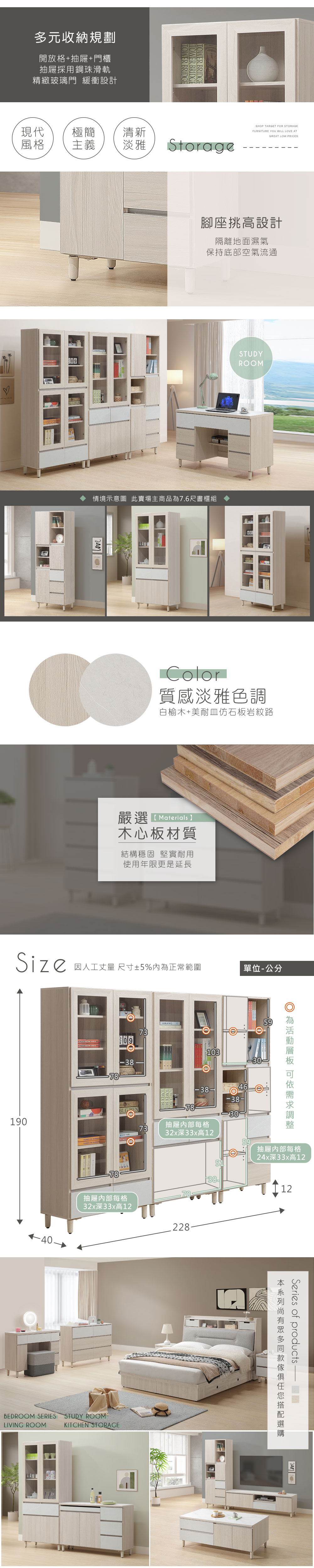 ◆抽屜+門櫃+開放格設計◆活動板,可依需求調整◆挑高腳,隔離地面濕氣◆抽屜採用鋼珠滑軌設計◆精緻玻璃門質感再升級◆緩衝門板,可減少噪音◆質感美耐皿仿石岩紋路◆嚴選木心板,穩固耐用◆美背處理,正反都美麗◆極簡主義,現代簡約風◆白榆木,清新淡雅色調◆免組裝,專人配送到府尺寸:寬 228 x 深 40 x 高 190 公分材質:高級木心板、美耐皿顏色:白榆木雙色產地:台灣誤差值:因人工丈量,尺寸±5%內為正常範圍