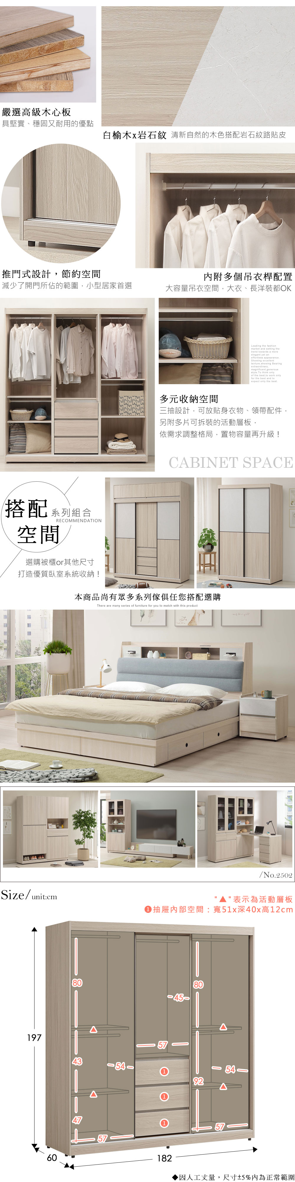◆嚴選高級木心板◆推門式設計,節省空間◆吊衣桿設計,方便吊掛衣物◆內附活動層板,可調整空間配置◆三格抽屜空間,可收納貼身衣物、配件◆美型仿石板岩紋風格的門片設計◆清新的淺色系搭配自然木紋肌理◆免自行組裝,專人配送到府尺寸:寬 182 x 深 60 x 高 197 公分材質:高級木心板、美耐皿顏色:白榆木雙色產地:台灣誤差值:因人工丈量,尺寸±5%內為正常範圍