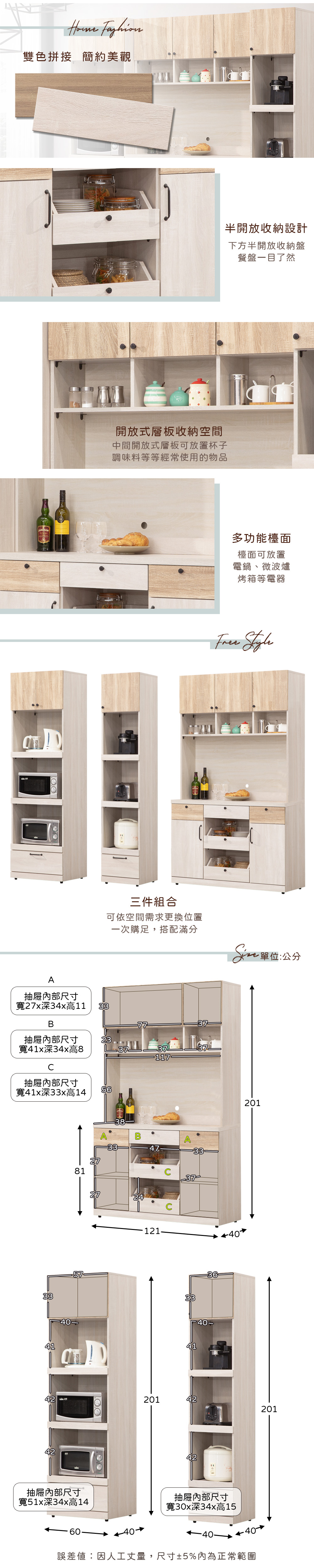 ◆雙色拼接,簡約美觀◆三件組合,可以需求更換位置◆半開放收納盤,餐具一目了然◆免自行組裝,專人配送到府◆廚房、餐廳收納好幫手◆可當餐櫃、高櫃、電器收納櫃、廚櫃◆六拉盤+七抽屜收納尺寸:寬 221 x 深 40 x 高 201 公分材質:高級木心板顏色:雪松+梧桐色產地:台灣誤差值:因人工丈量,尺寸±5%內為正常範圍