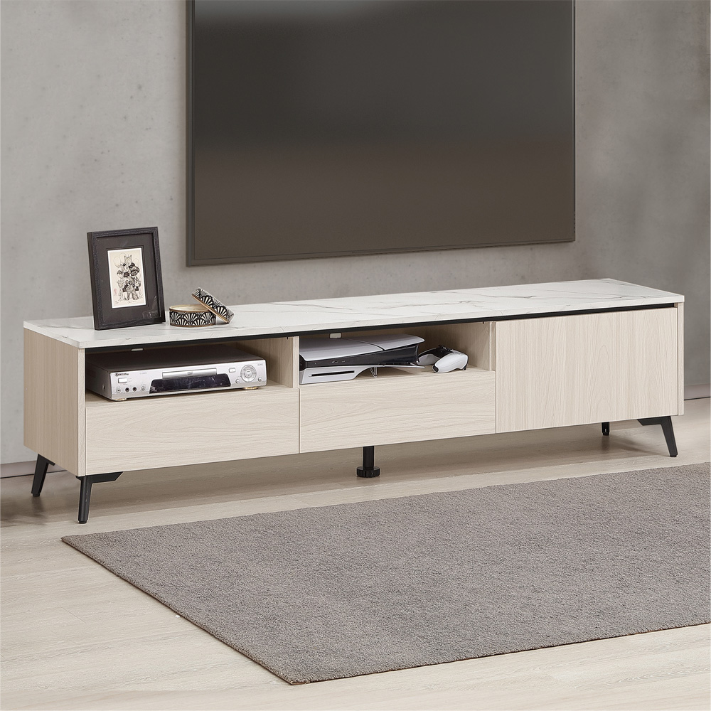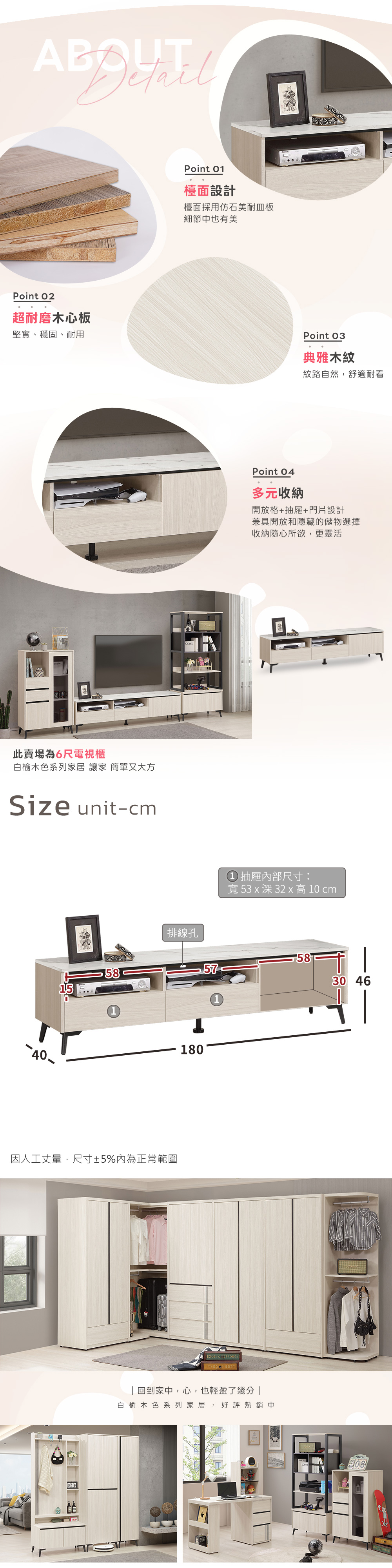 ◆白榆現代、英倫風格◆開放格+抽屜+門片設計◆仿石美耐皿板檯面◆免自行組裝,專人配送到府尺寸:寬 180 x 深 40 x 高 46 公分材質:高級木心板+仿石美耐皿板顏色:白榆木色產地:台灣誤差值: 因人工丈量,尺寸±5%內為正常範圍