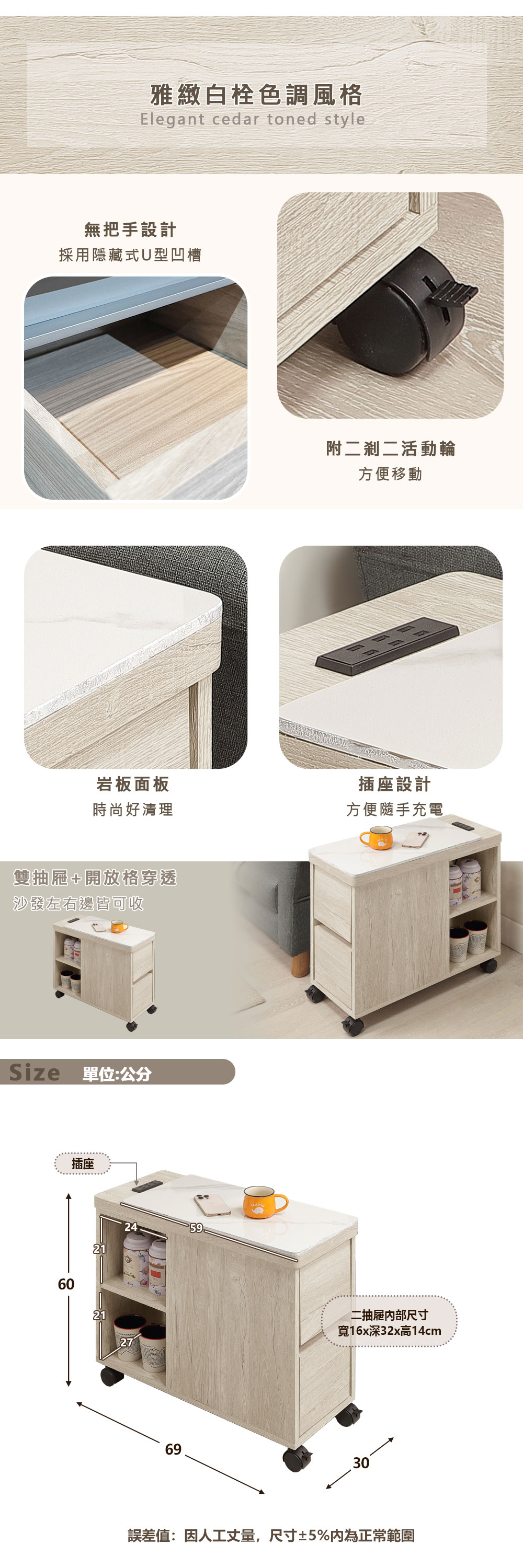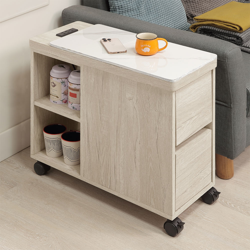 【Homelike】喜家居白栓木色岩板附插座活動沙發邊櫃(2504)