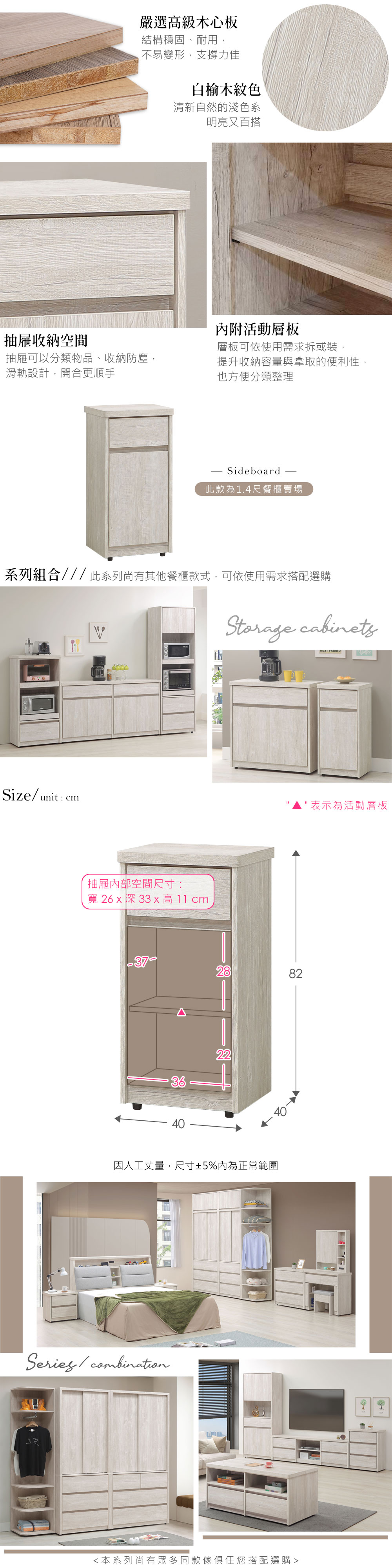 ◆木心板材質,堅實、穩固、耐用◆清新淺色系,質感木紋路視覺◆無把手設計,極簡美觀◆門櫃+抽屜的防塵收納規劃◆內附活動層板,可依需求拆、裝◆免組裝,由專人宅配到府尺寸:寬 40 x 深 40 x 高 82 公分材質:高級木心板顏色:白榆木色產地:台灣誤差值:因人工丈量,尺寸±5%內為正常範圍