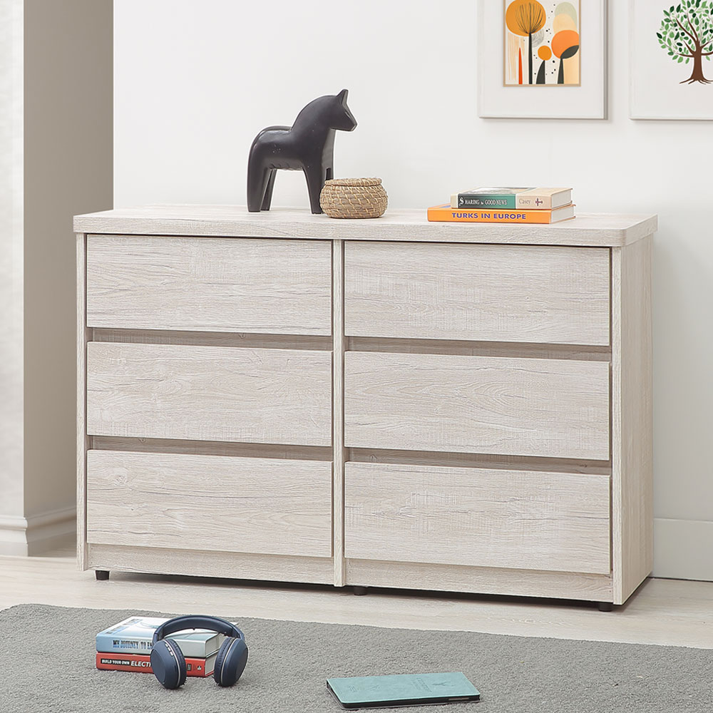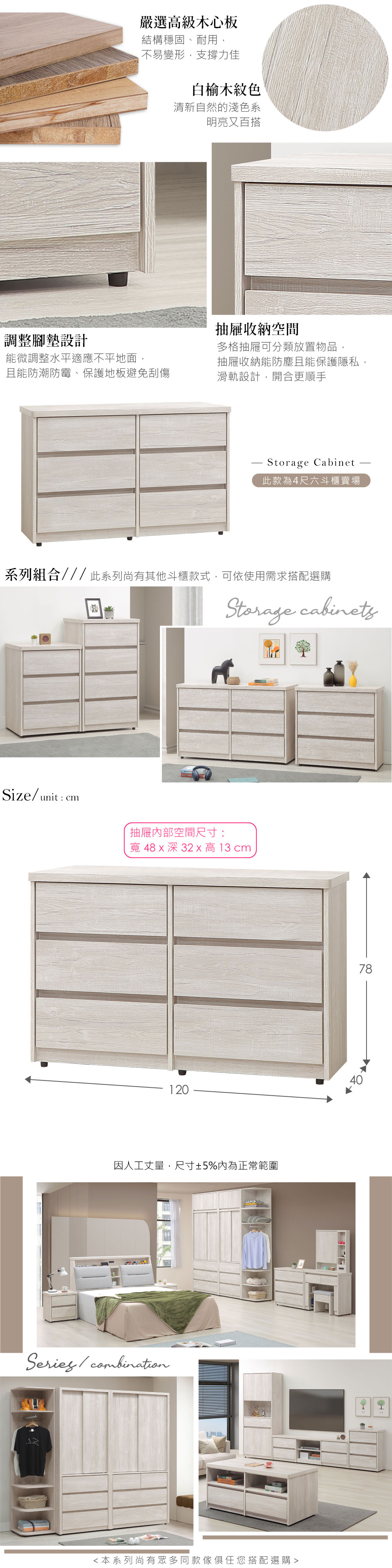 ◆木心板材質,堅實、穩固、耐用◆清新淺色系,質感木紋路視覺◆無把手設計,極簡美觀◆抽屜設計,收納防塵且能保護隱私◆六大抽屜空間,分類物品更整齊◆免組裝,由專人宅配到府尺寸:寬 120 x 深 40 x 高 78 公分材質:高級木心板顏色:白榆木色產地:台灣誤差值:因人工丈量,尺寸±5%內為正常範圍
