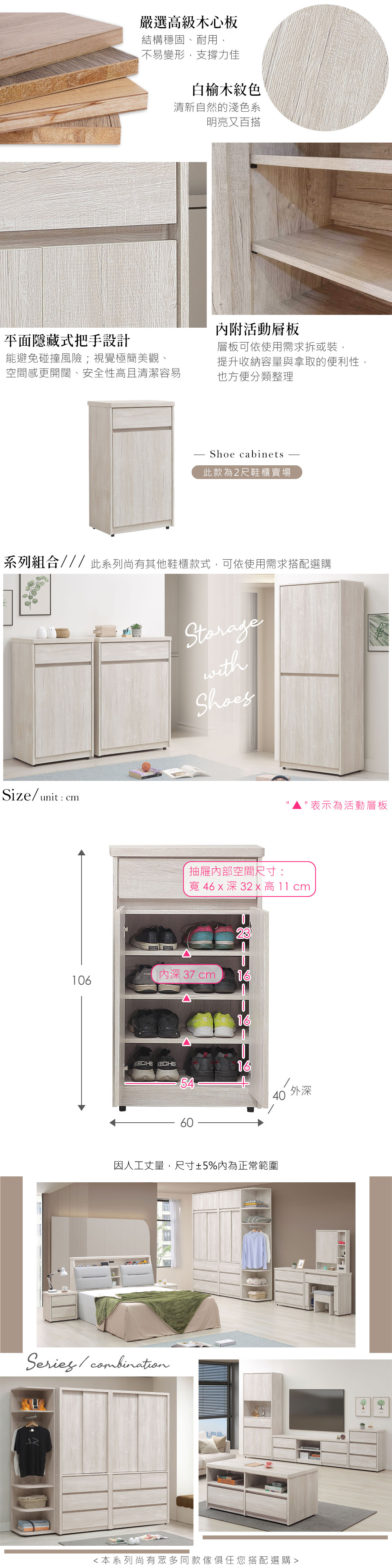 ◆木心板材質,堅實、穩固、耐用◆清新淺色系,質感木紋路視覺◆無把手設計,極簡美觀◆門櫃+抽屜的防塵收納設計◆內附活動層板,可依需求拆、裝◆免組裝,由專人宅配到府尺寸:寬 60 x 深 40 x 高 106 公分材質:高級木心板顏色:白榆木色產地:台灣誤差值:因人工丈量,尺寸±5%內為正常範圍