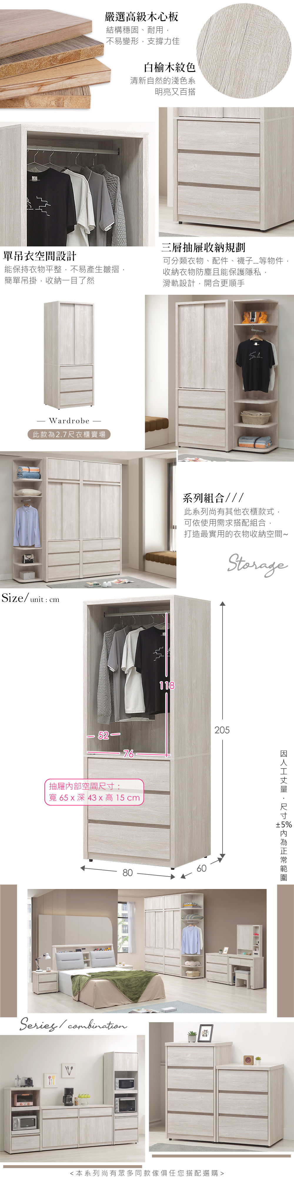 ◆木心板材質,堅實、穩固、耐用◆清新淺色系,質感木紋路視覺◆推門式設計,節約空間◆單吊衣桿空間,方便吊掛衣物◆抽屜設計,分類衣物、收納防塵◆免組裝,由專人宅配到府尺寸:寬 80 x 深 60 x 高 205 公分材質:高級木心板顏色:白榆木色產地:台灣誤差值:因人工丈量,尺寸±5%內為正常範圍