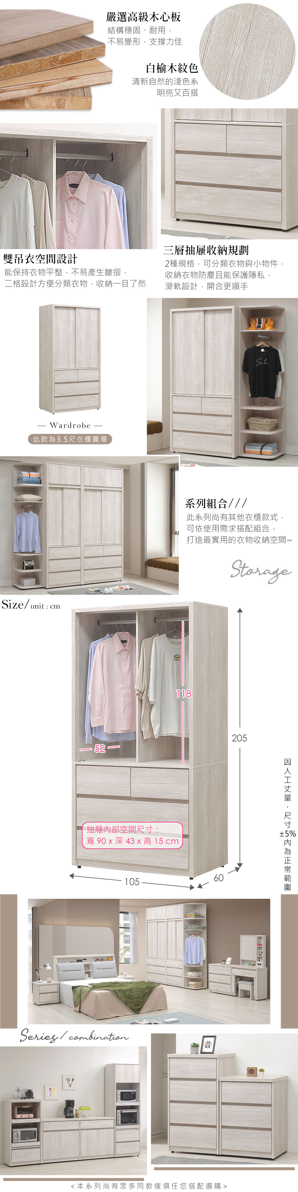 ◆木心板材質,堅實、穩固、耐用◆清新淺色系,質感木紋路視覺◆推門式設計,節約空間◆雙吊衣桿,方便吊掛衣物◆下方抽屜空間,能分類衣物、收納防塵◆免組裝,由專人宅配到府尺寸:寬 105 x 深 60 x 高 205 公分材質:高級木心板顏色:白榆木色產地:台灣誤差值:因人工丈量,尺寸±5%內為正常範圍