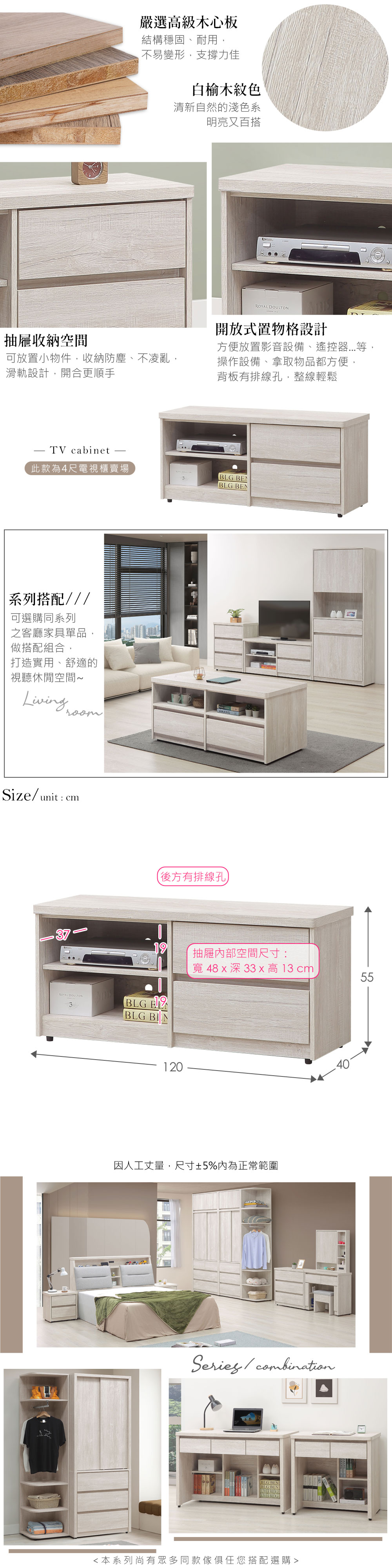 ◆木心板材質,堅實、穩固、耐用◆清新淺色系,質感木紋路視覺◆抽屜設計,能放各式小物,收納防塵◆開放置物格,可放書本、雜誌◆背板有排線孔,放影音設備整線輕鬆◆免組裝,由專人宅配到府尺寸:寬 120 x 深 40 x 高 55 公分材質:高級木心板顏色:白榆木色產地:台灣誤差值:因人工丈量,尺寸±5%內為正常範圍