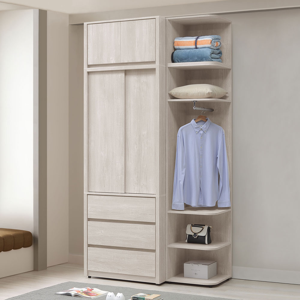 ◆木心板材質,堅實、穩固、耐用◆清新淺色系,質感木紋路視覺◆推門式設計,節約空間◆單吊衣桿空間,方便吊掛衣物◆下方抽屜空間,能分類衣物、收納防塵◆側邊開放式轉角櫃,方便隨手掛、隨手取◆上方被櫃收納空間,容量升級◆免組裝,由專人宅配到府尺寸:寬 128 x 深 60 x 高 250 公分材質:高級木心板顏色:白榆木色產地:台灣誤差值:因人工丈量,尺寸±5%內為正常範圍
