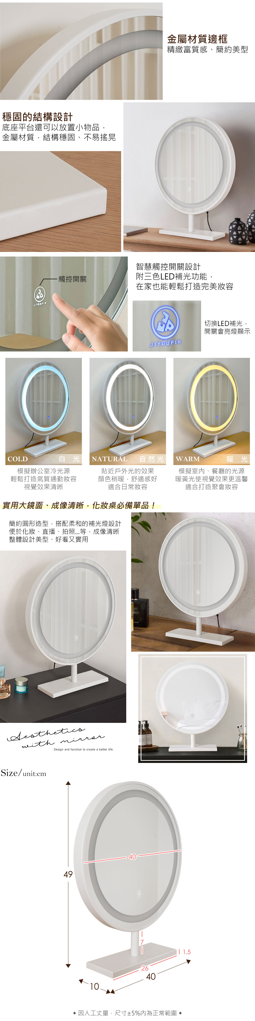 ◆金屬底座,結構穩固、不易搖晃◆鏡面面積大又清晰,好實用!◆三色LED補光:白光、自然光、暖光◆時尚、簡約的智慧觸控開關設計尺寸:寬 40 x 深 10 x 高 49 公分材質:銀鏡、金屬、LED燈顏色:白色產地:中國誤差值:因人工丈量,尺寸±5%內為正常範圍