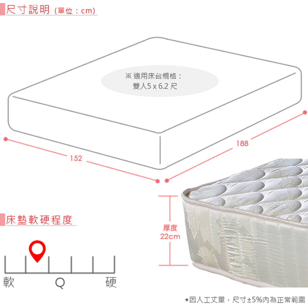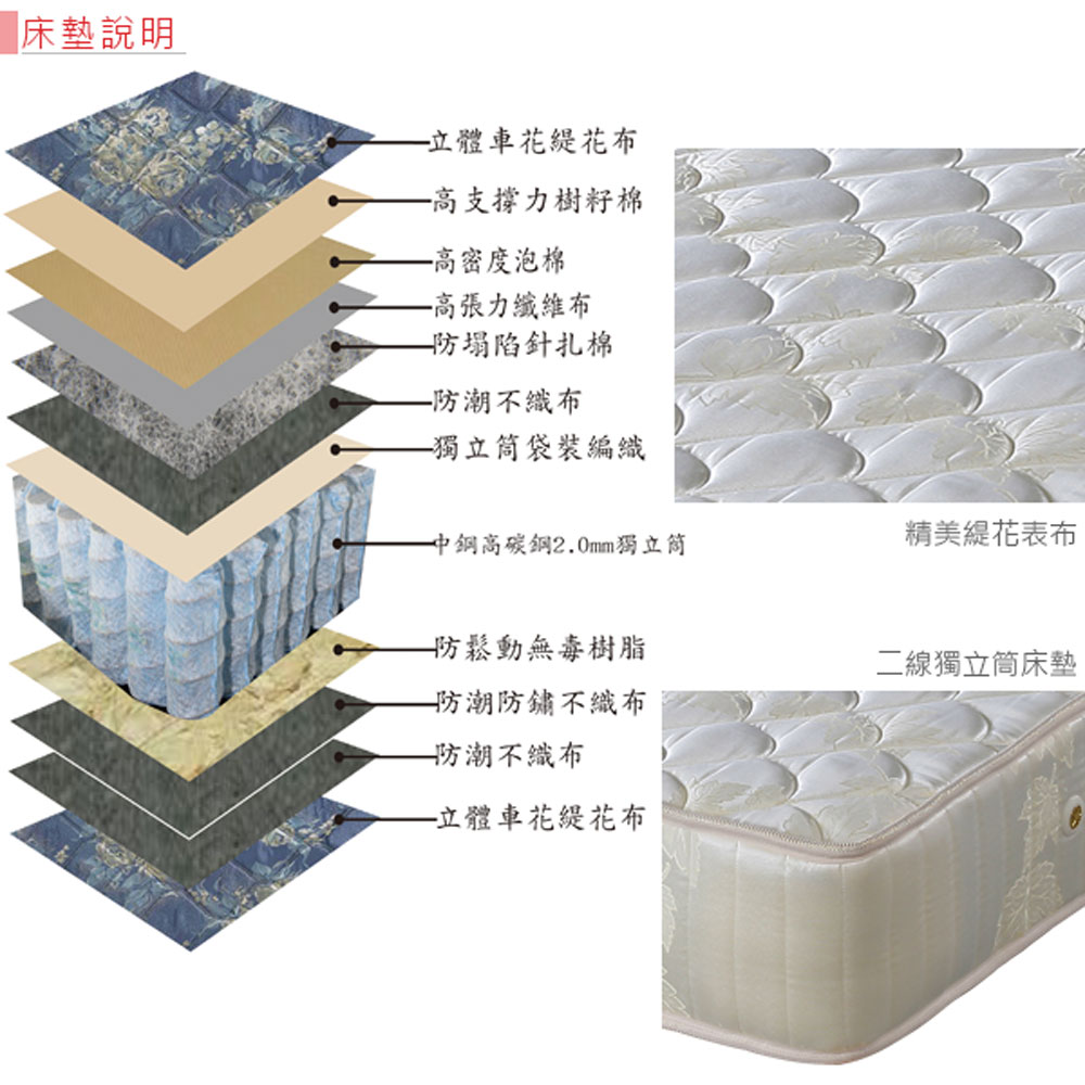 ◆採用2.0mm高碳鋼獨立筒◆具精緻質感的緹花表布◆100%台灣製造的好品質◆立體車花緹花布◆床墊軟硬度:Q軟◆厚度22公分尺寸:寬 152 x 長 188 x 厚 22 公分材質說明: 第一層-立體車花緹花布 第二層-高支撐樹籽棉 第三層-高密度泡棉 第四層-高張力纖維布 第五層-防塌陷針扎棉 第六層-防潮不織布 第七層-獨立筒袋裝編織 第八層-中鋼高碳鋼2.0mm獨立筒 第九層-防鬆動無毒樹脂 第十層-防潮防鏽不織布 第十一層-防潮不織布 第十二層-立體車花緹花布產地:台灣誤差值:因人工丈量,尺寸±5%內為正常範圍