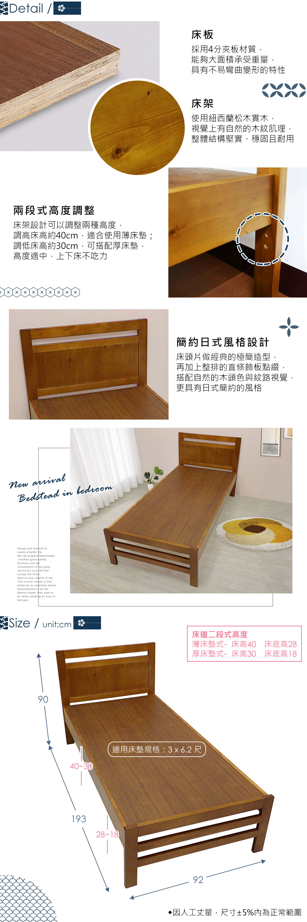 ◆經典的簡約日式風格設計◆嚴選高級紐西蘭松木材質◆可依需求調整二段高度◆專人配送到府組裝整組配件─ 3尺床架組 x 1 (不含床墊)尺寸:長 193 x 寬 92 x 高 90 公分適用床墊規格:3 x 6.2 尺材質:紐西蘭松木、4分夾板床板顏色:淺胡桃色產地:台灣誤差值:因人工丈量,尺寸±5%內為正常範圍