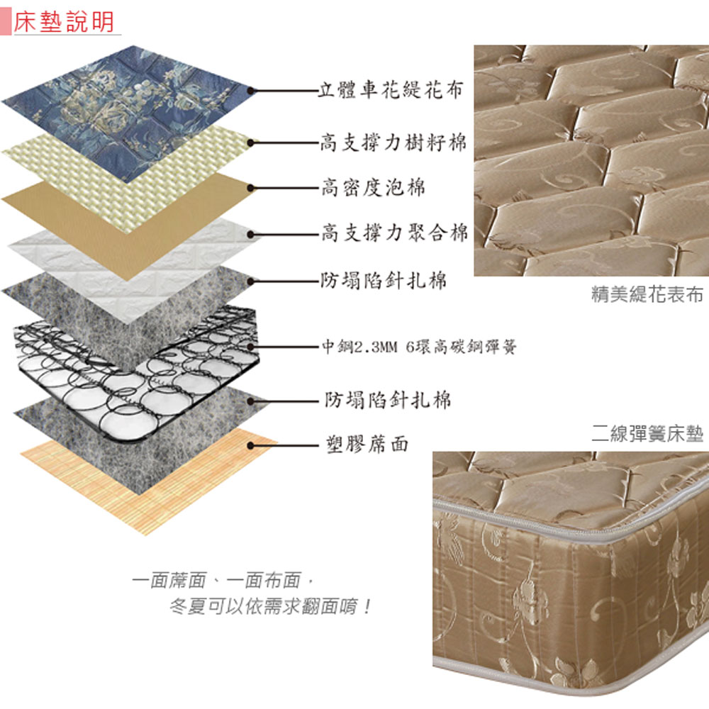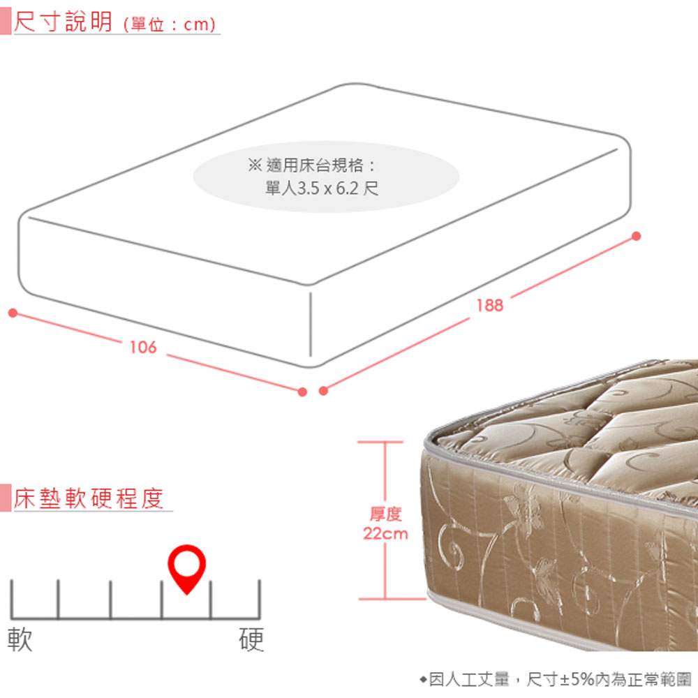 ◆2.3mm 6環高碳鋼彈簧◆一面蓆一面布冬夏兩用◆採用立體車花緹花表布◆相連結的彈簧◆床墊軟硬度:偏硬◆厚度22公分尺寸:寬 106 x 長 188 x 厚 22 公分材質說明: 第一層-立體車花緹花布 第二層-高支撐樹籽棉 第三層-高密度泡棉 第四層-高支撐力聚合棉 第五層-防塌陷針扎棉 第六層-中鋼2.3mm 6環高碳鋼彈簧 第七層-防塌陷針扎棉 第八層-塑膠蓆面產地:台灣誤差值:因人工丈量,尺寸±5%內為正常範圍