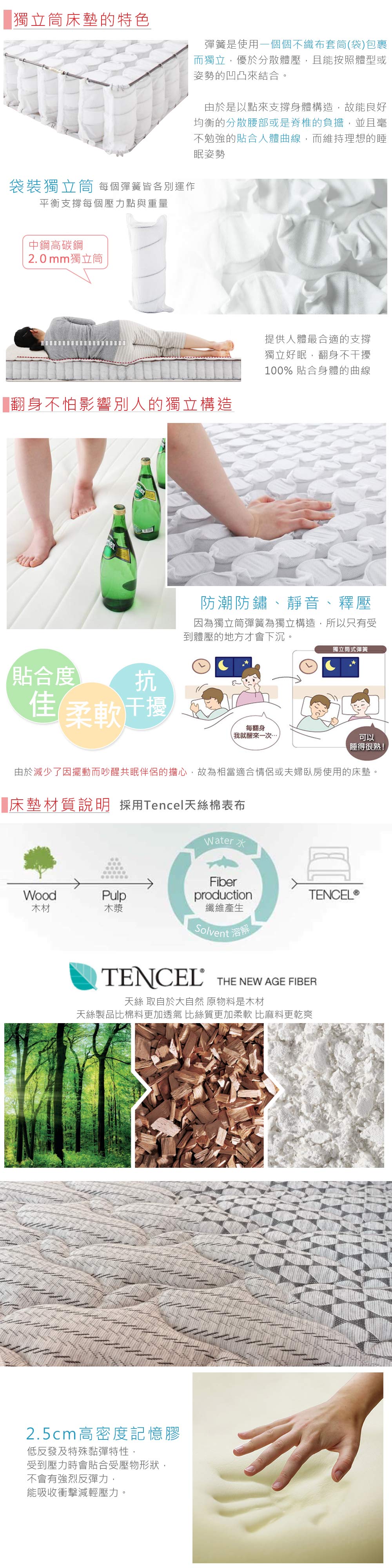 ◆優質2.5cm高密度記憶膠◆TENCEL天絲棉表布◆2.0mm中鋼高碳鋼獨立筒◆床墊軟硬度:軟Q◆厚度27公分◆專人配送,到府安裝尺寸:寬 182x 長 188 x 厚 27 公分材質說明: 第一層-TENCEL天絲棉表布 第二層-高支撐樹籽棉 第三層-高密度泡棉 第四層-高張力纖維布 第五層-2.5cm高密度記憶膠 第六層-防塌陷針扎棉 第七層-防潮不織布 第八層-獨立筒袋裝編織 第九層-中鋼高碳鋼2.0mm獨立筒 第十層-防鬆動無毒樹脂 第十一層-防潮防鏽不織布 第十二層-高張力纖維布 第十三層-立體車花緹花布產地:台灣誤差值:因人工丈量,尺寸±5%內為正常範圍