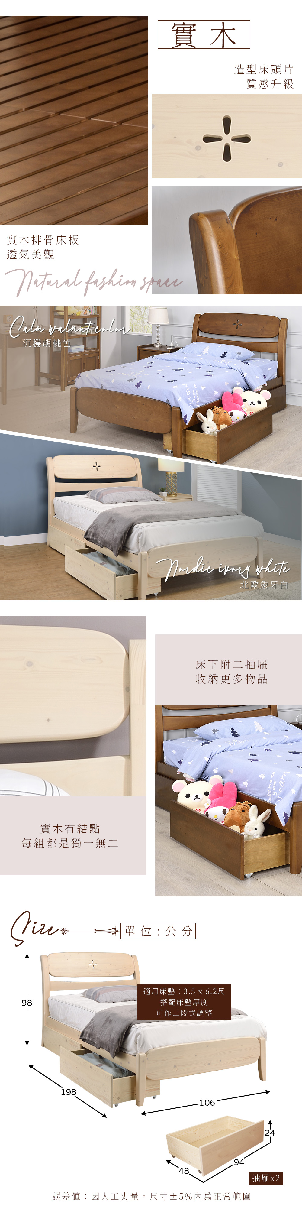 ◆透氣床板設計,透氣不悶熱◆床下附抽屜,方便收納◆實木材質,美觀耐用◆免組裝,專人配送到府整體配件:3.5尺床架 x 1+床下抽屜x2 (不含床墊)尺寸:寬106 x 深198 x 高 98 公分適用床墊:3.5 x 6.2 尺材質:實木框、實木夾板顏色:胡桃色產地:越南誤差值:因人工丈量,尺寸±5%內為正常範圍