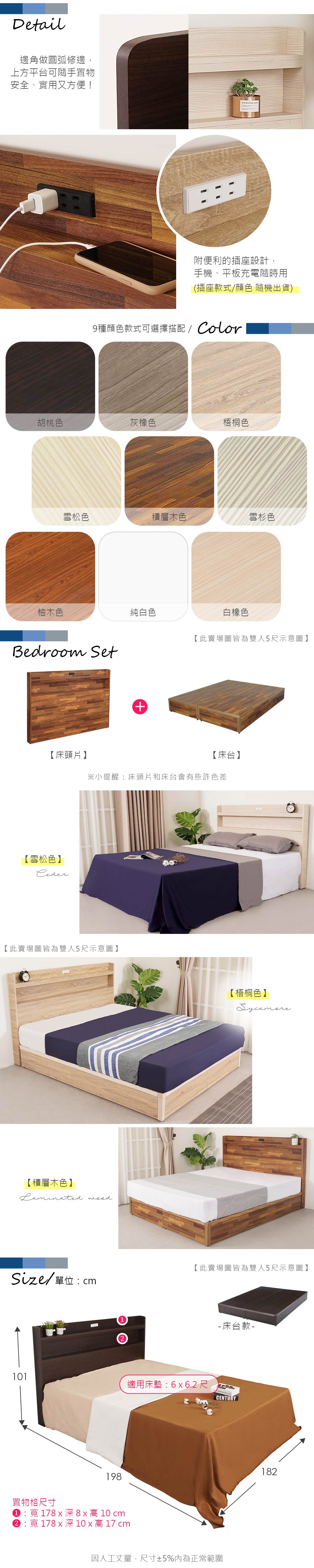 ◆木心板材質,堅實耐用◆附有插座,充電超方便◆床組多色可選,好搭配◆免組裝,專人宅配到府◆床頭片+床台整組商品:6尺床頭片 + 6尺床台(不含床墊)尺寸:寬 182 x 深 198 x 高 101 公分適用床墊:6 x 6.2 尺材質:高級木心板、三分夾板顏色:梧桐色產地:台灣誤差值:因人工丈量,尺寸±5%內為正常範圍