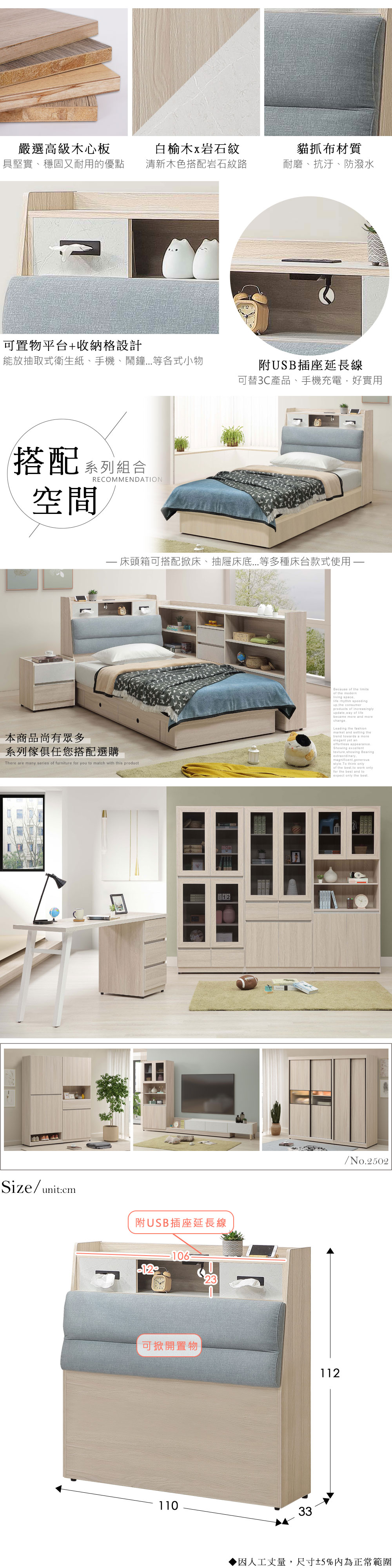 ◆嚴選高級木心板◆舒適、耐磨的貓抓布材質靠墊◆附USB、面紙收納格,實用多功能◆掀式床頭箱,大空間,可做被櫥使用◆清新的淺色系搭配自然木紋肌理◆免自行組裝,專人配送到整組商品:床頭箱 x 1尺寸:寬 110 x 深 33 x 高 112 公分適用床組規格:3.5 x 6.2 尺材質:高級木心板、貓抓布靠墊、美耐皿顏色:白榆木雙色產地:台灣誤差值:因人工丈量,尺寸±5%內為正常範圍
