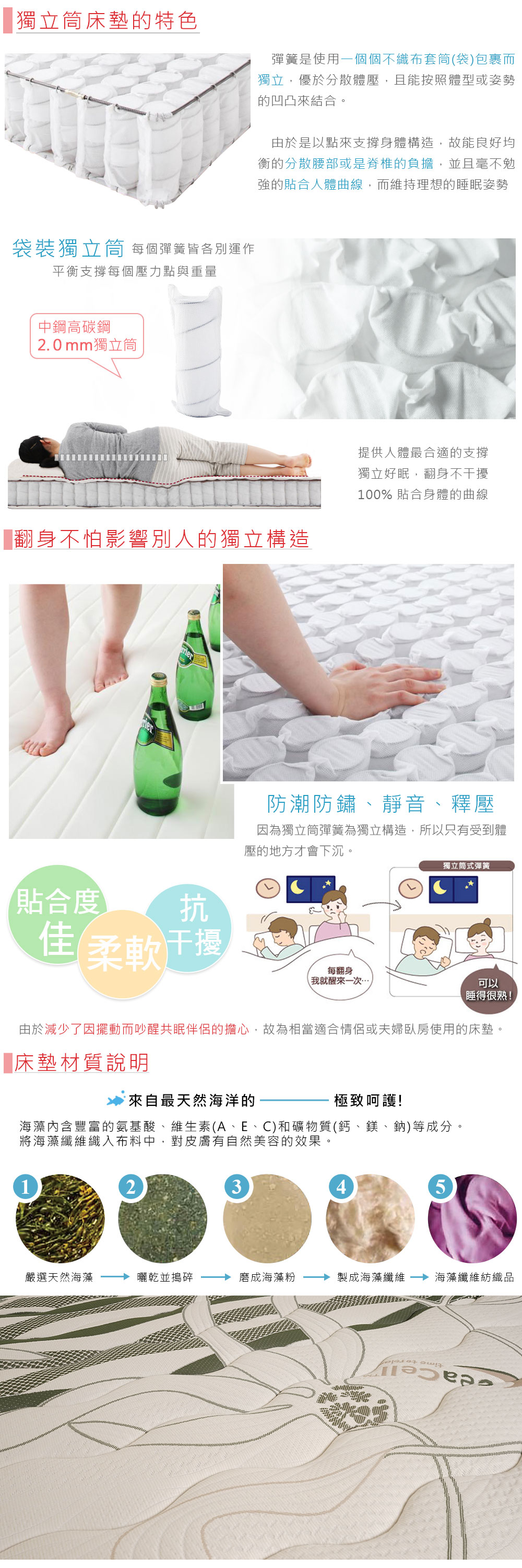 ◆海藻纖維表布◆藻類特性,柔軟絲滑質感◆使用2.0mm中鋼高碳鋼獨立筒◆互不干擾的獨立筒結構◆品質保證100%台灣製造◆專人配送,到府安裝整組配件:床墊 x1(不含床台)尺寸:寬 152 x 長 188 x 厚 27 公分材質說明: 第一層-海藻纖維SeaCell布 第二層-高支撐力樹籽棉 第三層-高密度泡棉 第四層-高支撐力聚合棉 第五層-高張力纖維布 第六層-高密度聚合棉 第七層-防鬆動無毒樹脂 第八層-中鋼高碳鋼2.0mm獨立筒 第九層-防鬆動無毒樹脂 第十層-獨立筒袋裝編織 第十一層-高張力纖維布 第十二層-防潮防鏽不織布 第十三層-防潮不織布 第十四層-高支撐力杜邦棉 第十五層-止滑精梳棉平織布產地:台灣誤差值:因人工丈量,尺寸±5%內為正常範圍
