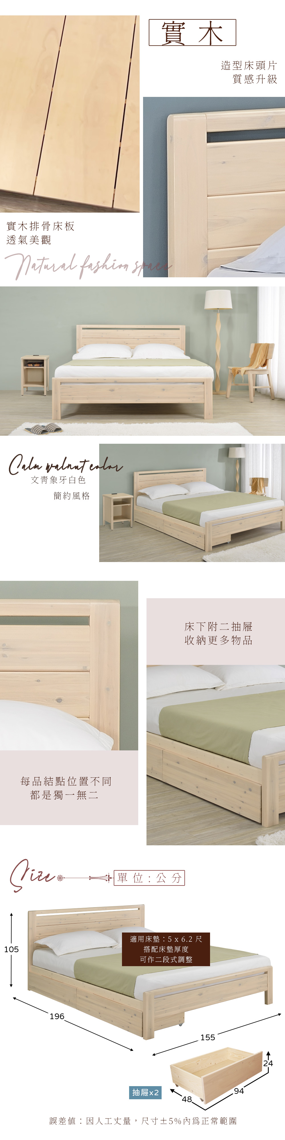 ◆透氣床板設計,透氣不悶熱◆床下附二抽屜,方便收納◆簡約質感造型床頭◆免組裝,專人配送到府◆床架可二段式調整高度整體配件:5尺床架 x 1+床下抽屜x2 (不含床墊)尺寸:寬 155 x 深 196 x 高 105 公分適用床墊:5 x 6.2 尺材質:實木框、實木夾板顏色:象牙白色產地:越南誤差值:因人工丈量,尺寸±5%內為正常範圍